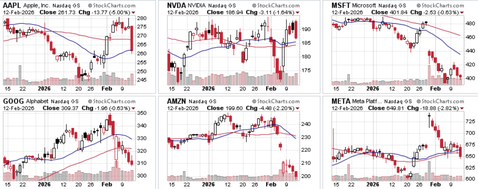 De afstand tot de recente all-time highs geeft een goed beeld van waar we momenteel staan. De S&P 500 noteert op 6.941, amper 1% onder het record van 7.002 (28 januari). De Nasdaq 100 staat rond 25.100 en dat is circa 4% onder de top van 26.182. De Dow Jones sloot met 50.121 iets lager maar blijft en boven de 50K en dicht bij de hoogste stand ooit.