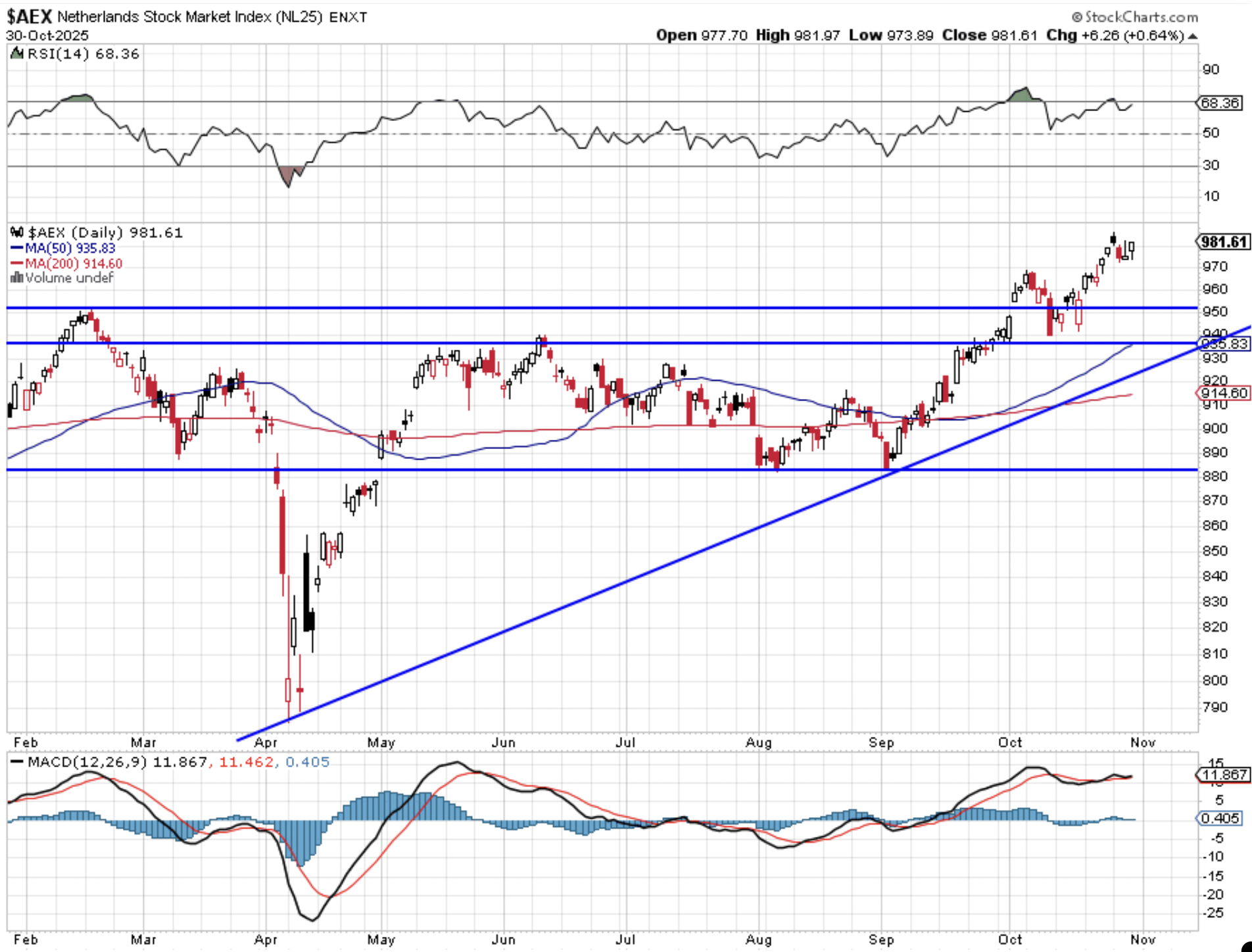 Je ziet een index die in een duidelijke opwaartse trend zit. Na maanden van zijwaarts bewegen is de koers in oktober uitgebroken boven de weerstand rond 940 punten. De combinatie van stijgende gemiddelde lijnen, een hogere RSI en een positieve MACD ondersteunt het huidige optimisme.