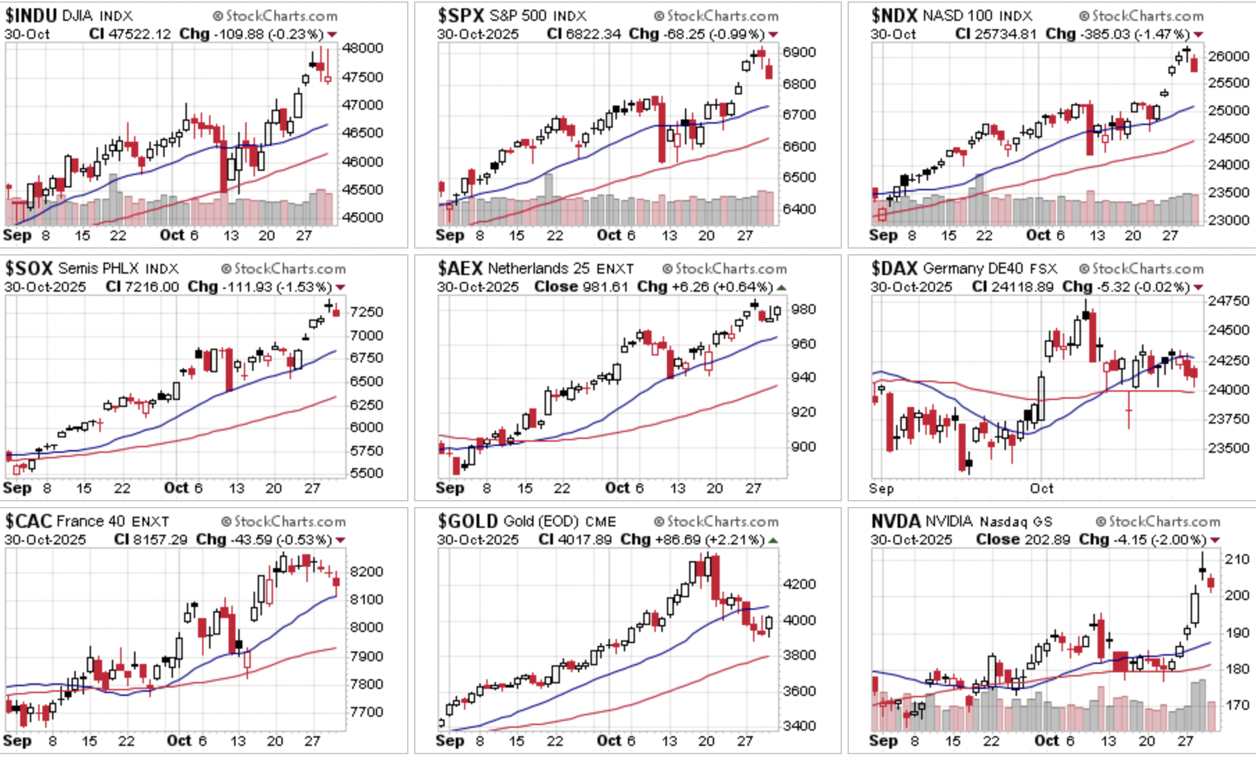 - VS-markten (DJIA, S&P 500, Nasdaq 100) tonen allemaal afkoeling. De candles van 30 oktober laten rode bodies zien net onder recente toppen. Dit wijst op winstnemingen na een snelle rally. De Nasdaq 100 en vooral de halfgeleiderindex (SOX) corrigeren het sterkst, wat erop wijst dat de technologie- en AI-gerelateerde aandelen het zwaartepunt van de daling op zich nemen.