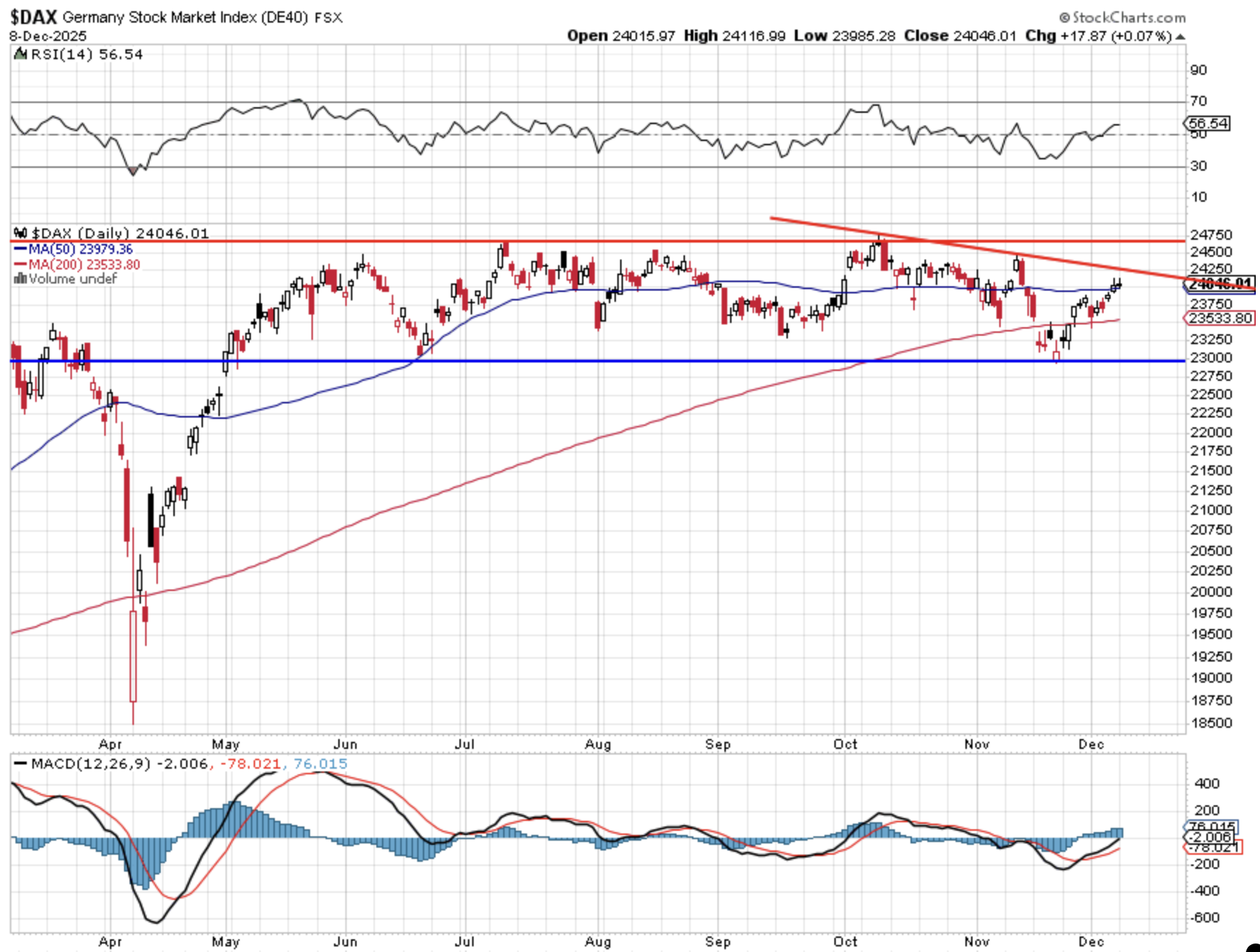 De DAX‑grafiek laat een brede zijwaartse fase zien tussen grofweg 23.300–23.500 steun en 24.300–24.700 weerstand, met een recent herstel richting de dalende toppenlijn maar nog zonder echte uitbraak. De hoofdstructuur is nu een consolidatie: recente bodems zijn iets hoger, maar de toppen liggen nog steeds lager dan in de zomer/najaar.