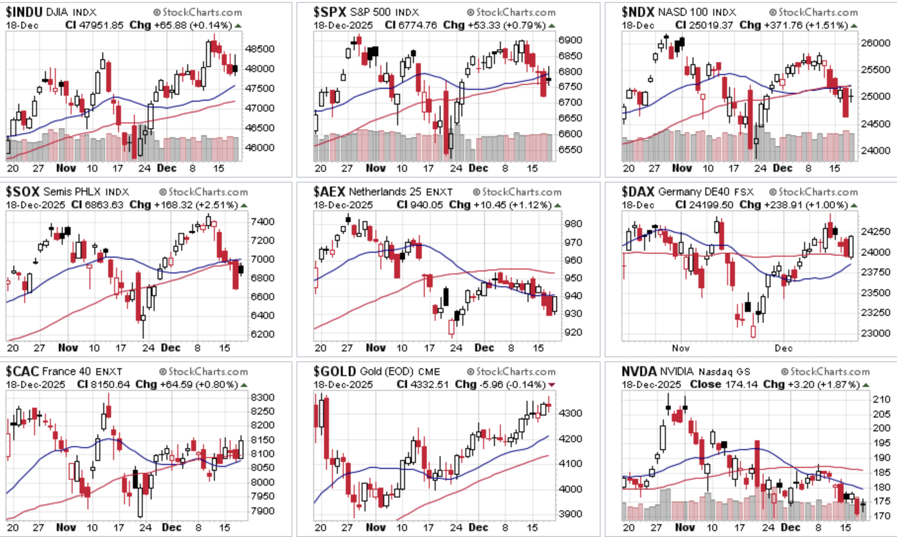 Ook de grote Europese indices sluiten hoger na de rally op Wall Street. De CAC 40 (0,8%) en de DAX (1%) sluiten in het groen. De AEX won 1,12% terwijl de BEL 20 zo'n 0,2% winst boekte. Toch blijft de handel dus richting het einde van het jaar, het is nu zoeken waar de indices het jaar op kunnen afsluiten.