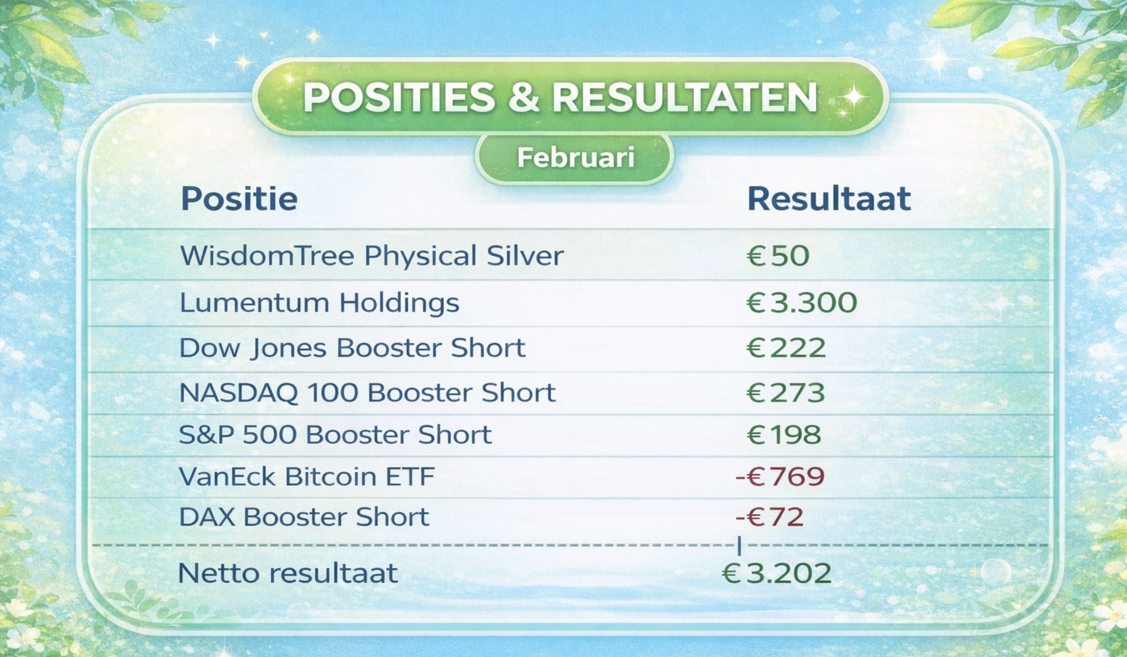 De eerste winst voor dit jaar ziet u via de tabel hieronder, een prima verloop deze maand en er komen denk ik nog wel wat kansen waar ik iets mee kan doen. Wordt op tijd lid via de nieuwe aanbieding, dan ontvangt u meteen onze signalen en doet u mee.