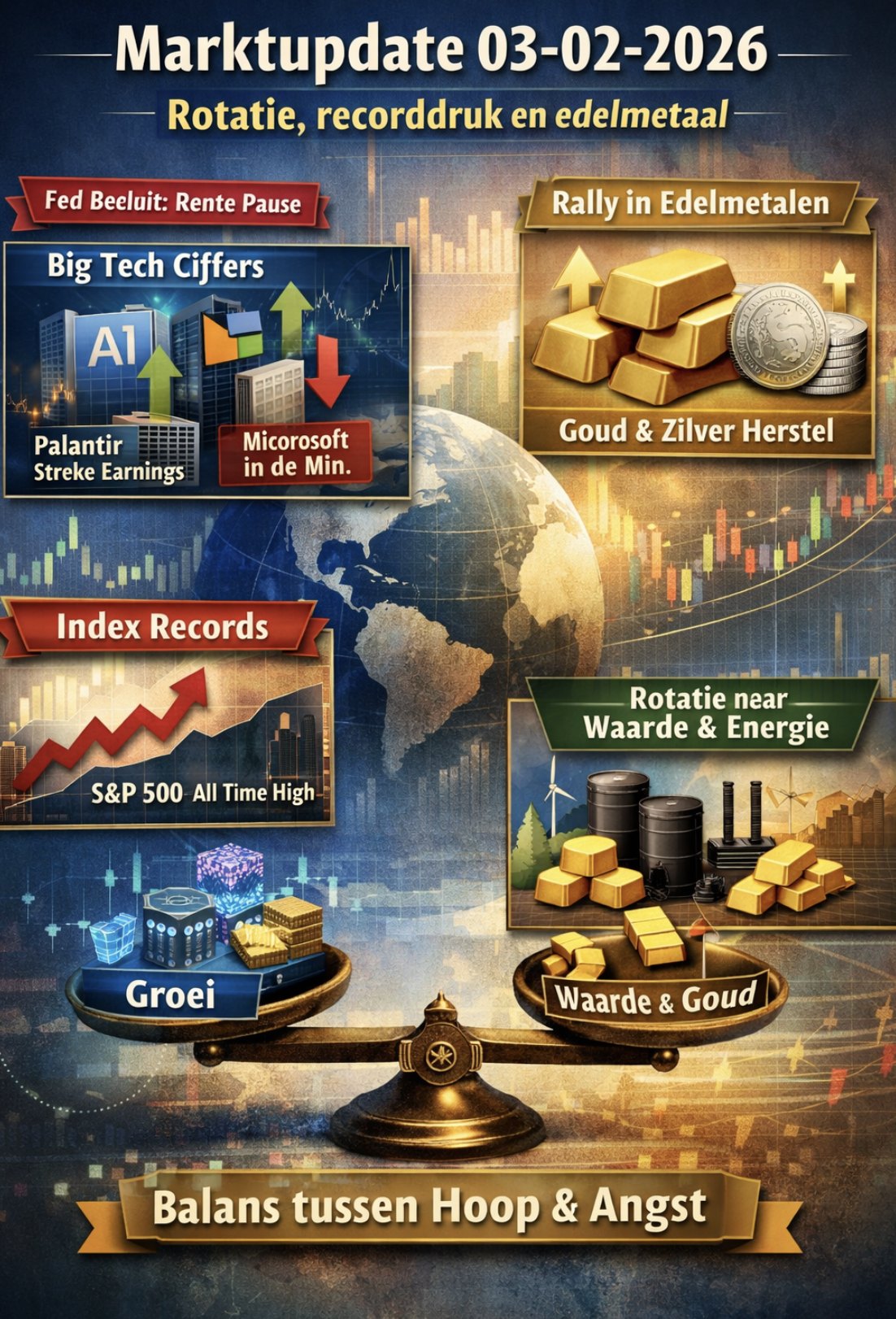 De grote vraag: is dit het begin van een nieuwe fase waarin macro-zorgen (schulden, politieke risico's) zwaarder gaan wegen, of blijft AI-optimisme overheersen? Het antwoord ligt deels bij de Alphabet, AMD- en Amazon-cijfers deze week, en deels bij de Fed-retoriek. Maar ook bij de vraag of goud zijn comeback kan vasthouden of dat dit slechts een technische bounce is.