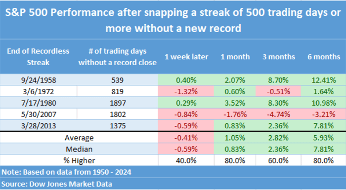 Door het record van vrijdag werd er ook een reeks van 512 handelsdagen zonder een nieuw record gestopt. Daarmee kwam er een einde aan het langste traject zonder records sinds de reeks van 1.375 handelsdagen die duurde van oktober 2007 tot maart 2013. In de tabel hieronder ziet u enkele reeksen staan. Opvallend daarbij is dat de S&P 500 na het doorbreken van dat record de periode daarna makkelijk nog veel hoger weet te geraken, alleen in 2007 lukte dat niet zien we hieronder.