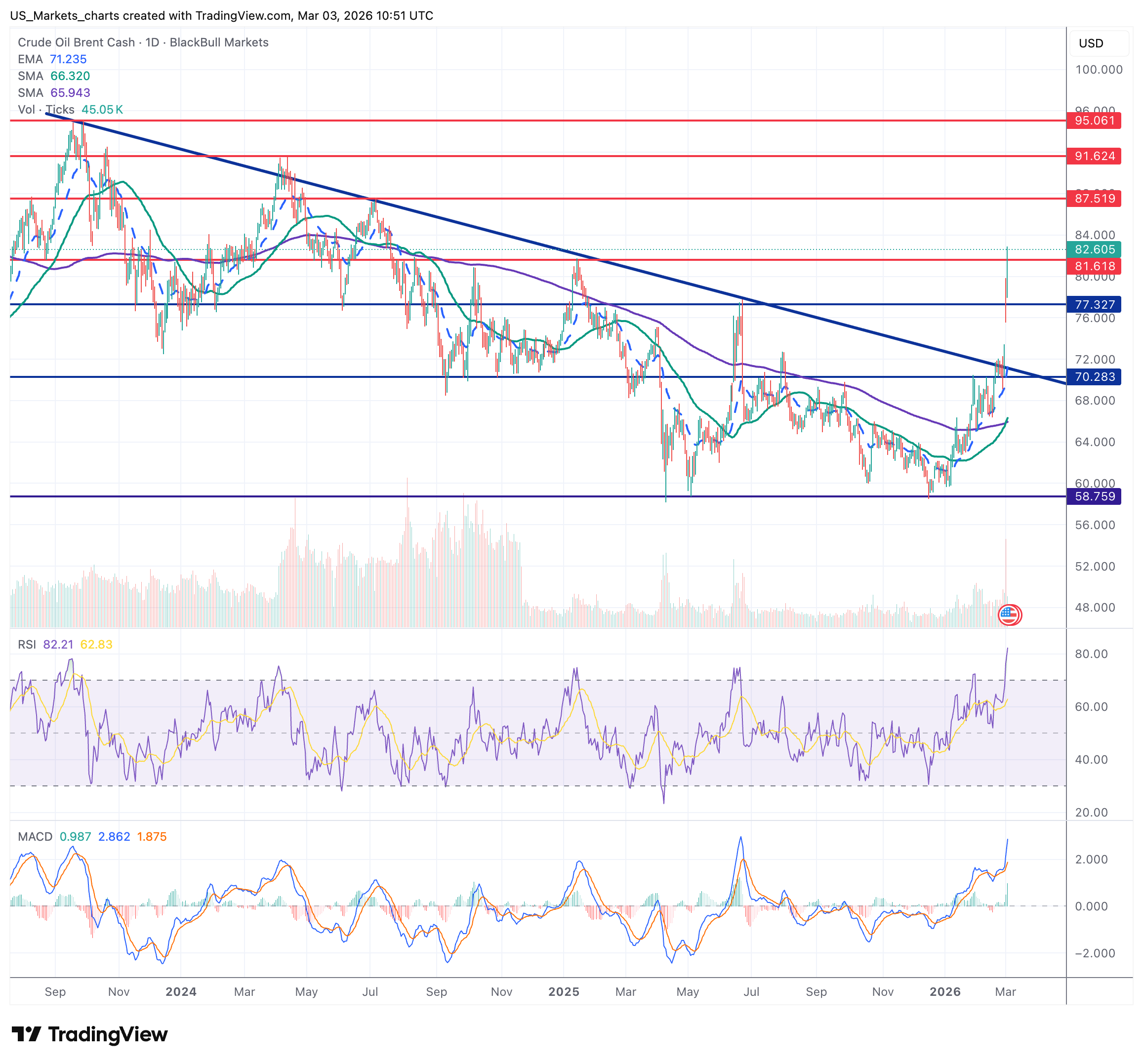 Brent noteert op $83,20 (+7,02%) na een explosieve beweging vandaag. De directe aanleiding is het nieuws dat Iran de Straat van Hormuz heeft gesloten na Amerikaanse en Israëlische aanvallen. De koers heeft het dalende trendkanaal overtuigend gebroken en staat nu ruim boven EMA-20 ($71,25) en SMA-50 ($66,3). Dagrange: $77,37 - $83,45. Eerste weerstand op $87,5, daarboven $91,5.