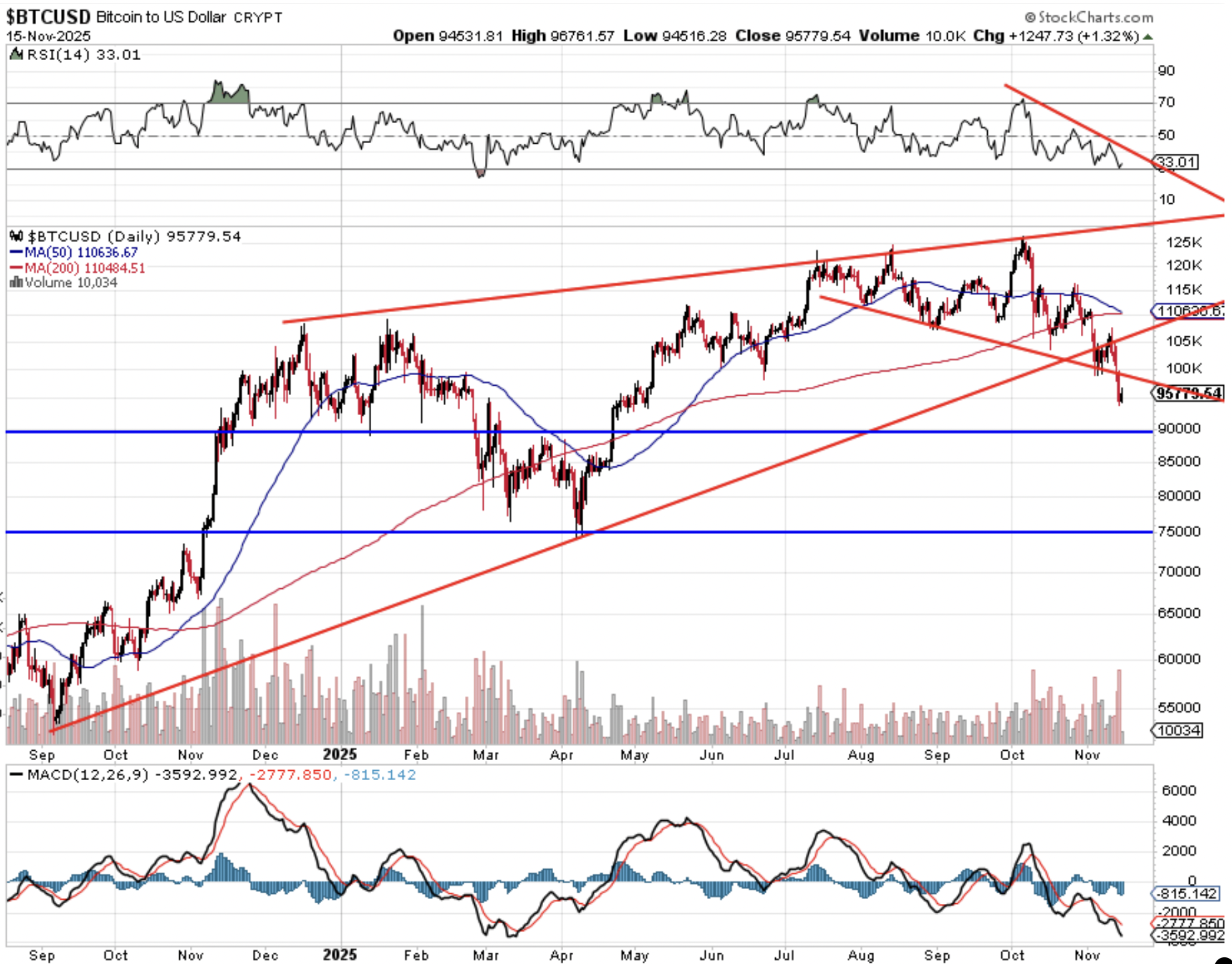 Dit is de echte test. Als de koers hier doorheen zakt, dan ligt de weg open naar een veel dieper koersdoel van ergens tussen de $82.500 – $85.000 dollar.