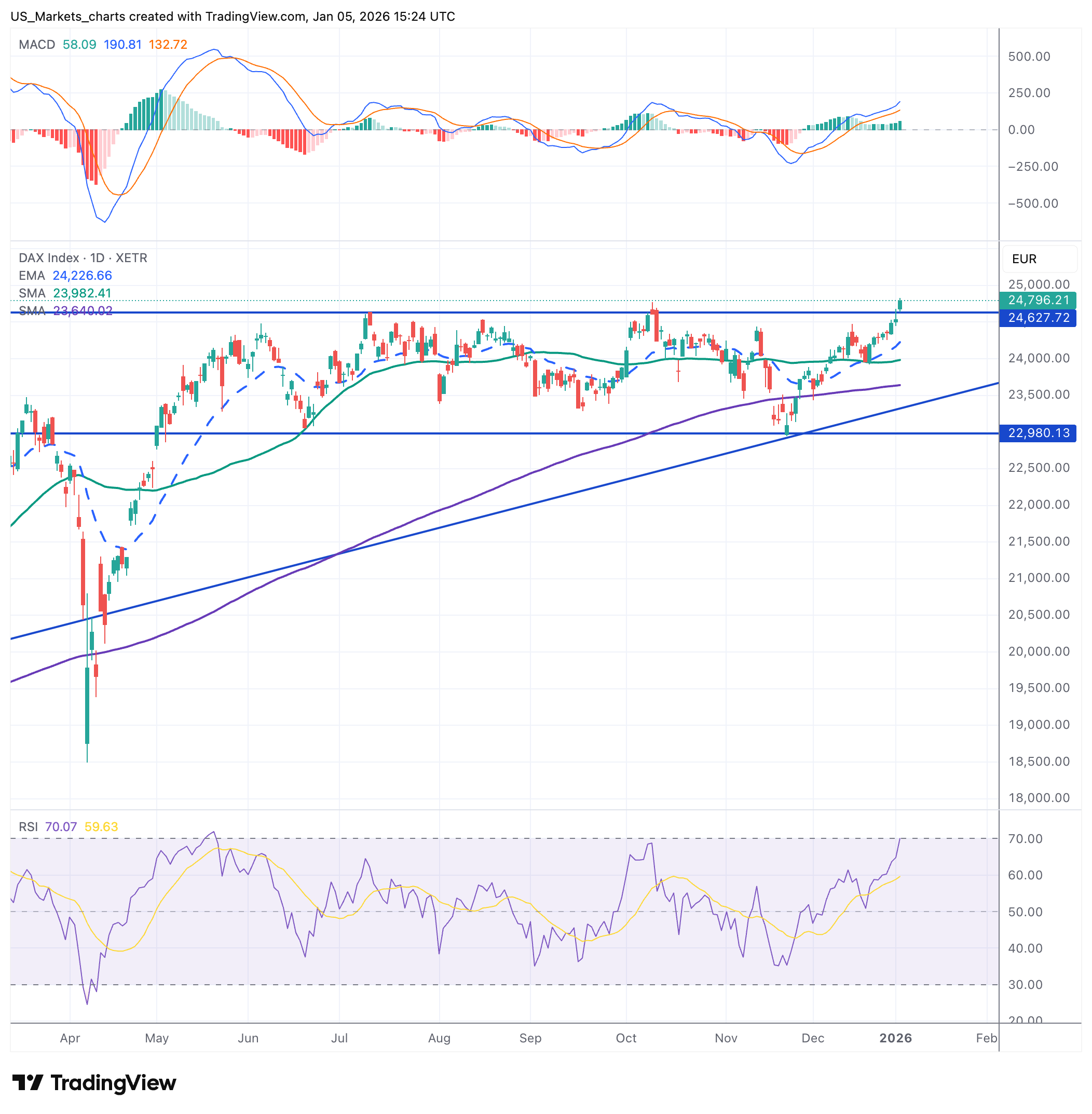 Weerstand: 24,796 (huidige uitbraak/high), daarna 25,000 (psychologisch), en hogerop ~25,300 – 25,500 als volgende zone (minder “bewezen” in deze chart). Steun: 24,627 (oude range-top → nu sleutelsteun), ~23,980 – 24,000 (pivot/MA-confluence), en 22,980 (grote horizontale support).