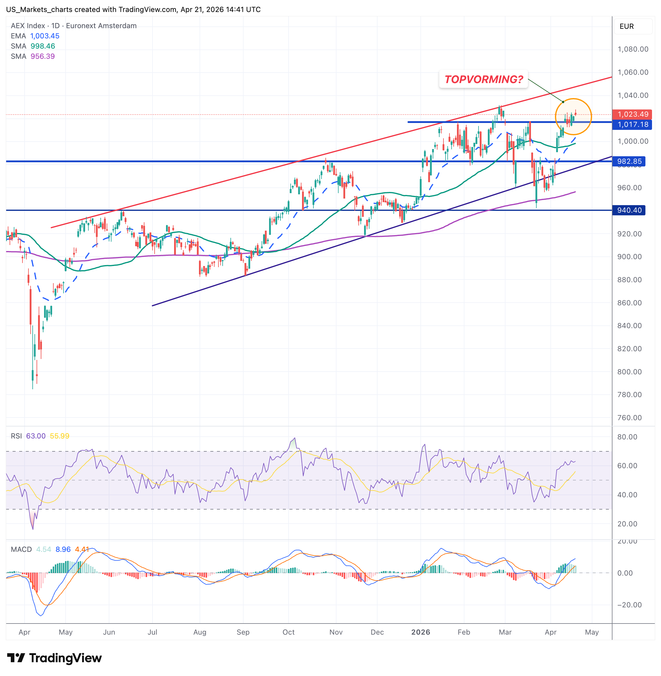 De AEX handelt op 1.023, net boven de hardnekkige weerstandszone rond 1.017. Op de grafiek is duidelijk een potentiele topformatie zichtbaar, de koers kleeft al sinds februari aan deze zone en vindt steeds opnieuw geen echte doorbraak. De koers ligt ook precies aan de bovenkant van het opwaartse trendkanaal, wat technisch een kwetsbare plek is.