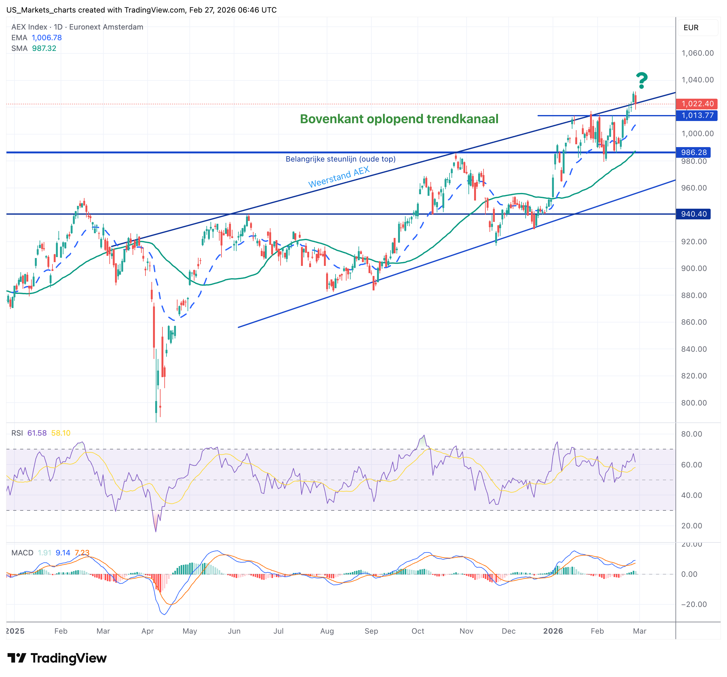 Boven 1.030 loopt weerstand door tot 1.050 punten. De RSI staat rond de 60, dat is neutraal. Het MACD is positief maar momentum zwakt wat af. Dit ziet er voorzichtig uit. Echter: de marktbreedte in Amsterdam blijft sterk. De Technologie aandelen staan wat onder druk terwijl de defensieve waarden en de financials het wat beter doen.