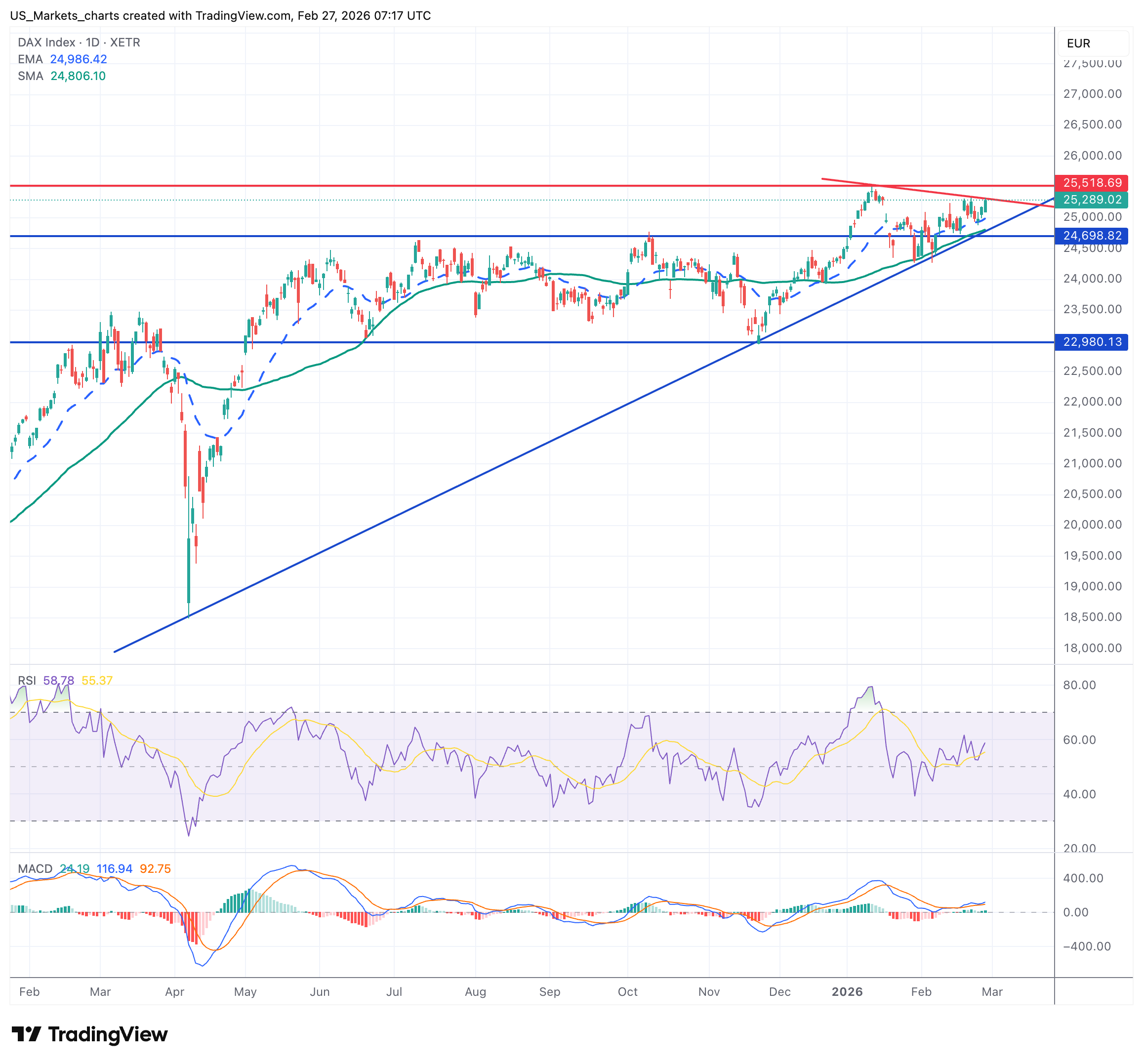 De DAX staat op 25.289 punten (plus 0,45%) en toont veerkracht ondanks zwakke US tech. De Duitse index staat boven zowel het 20- als het 50-daagse gemiddelde wat bullish is. Support op 25.100-24.900 en 24.700 punten blijft cruciaal. Weerstand ligt er op 25.500, waar oude toppen uitkomen.. De RSI staat op 56, neutraal. Het MACD is positief met groene histogram. Dit ziet er constructief uit.