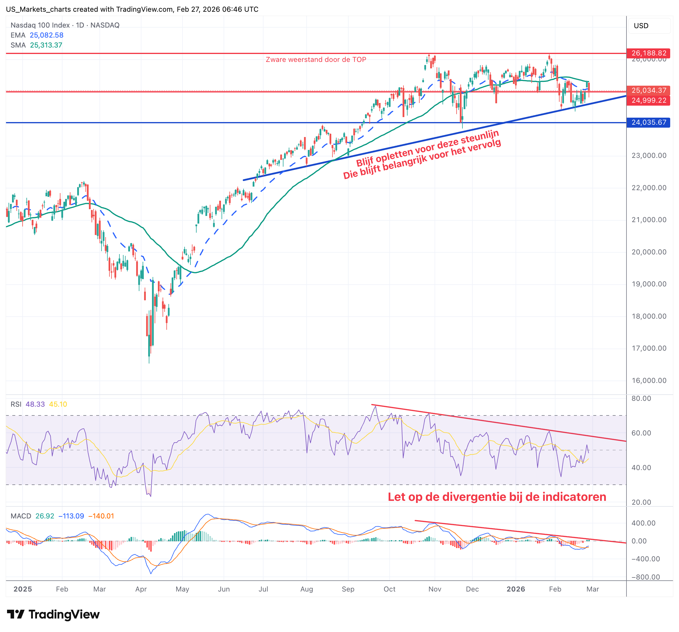 De RSI staat rond 65, wat duidt op neutraal. De MACD toont nog positieve signalen maar de divergentie waarschuwingen beginnen op te duiken. Technisch gezien: een voorzichtige tot neutrale houding. De breedte van de markt verslechtert duidelijk (meer aandelen dalen dan stijgen), wat suggereert dat deze rally slechts technologie-gedreven is.