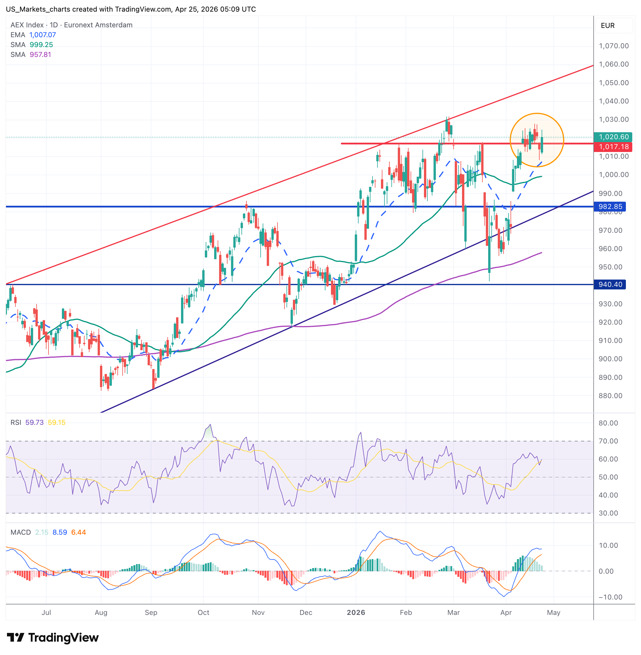De AEX noteert 1.020,60 en heeft het topvorming-patroon rond de 1.025 dat we al weken signaleren en niet kunnen doorbreken. De Amsterdamse hoofdindex blijft hangen rond de zone 1.015 tot 1.025, en is nog altijd niet in staat om de all-time high van begin februari (boven de 1.040) te heroveren. De divergentie met Wall Street is in de afgelopen week alleen maar groter geworden: terwijl de Nasdaq +4.500 punten maakte vanaf de bodem eind maart, hangt de AEX in een nauwe range.