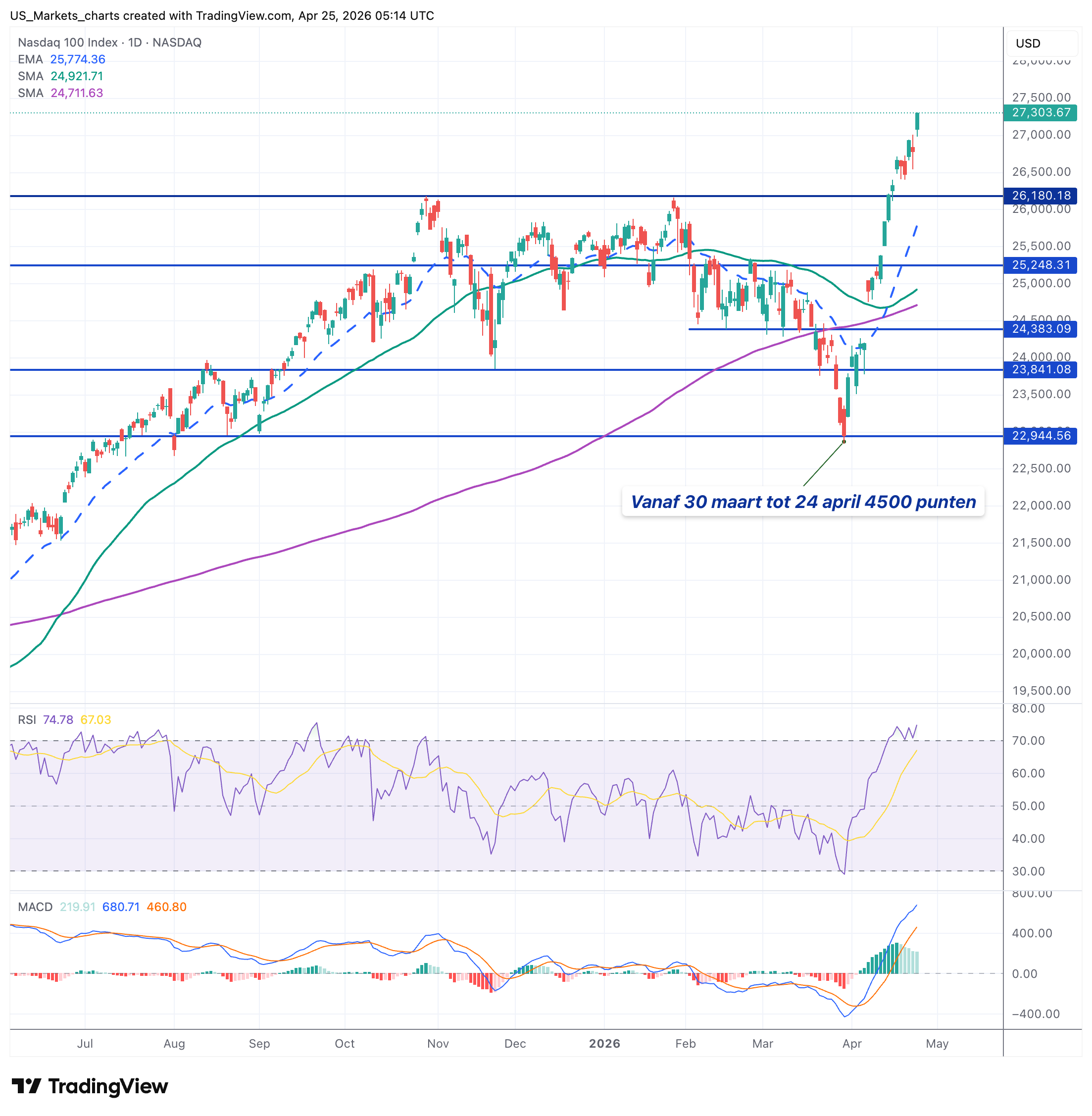 Technisch staat de RSI nu op 75, ruim in het overbought-gebied. De MACD blijft enorm positief, maar het histogram begint te krimpen als eerste teken van afnemend momentum. Boven 27.300 is er geen echte weerstand meer te vinden, alleen ronde getallen als 27.500, 27.750 en 28.000. Onder de oppervlakte: 26.200 als eerste steun, daaronder 25.850. Een terugval richting 26.200 lijkt op de korte termijn niet onwaarschijnlijk, vooral als de Mag Four-cijfers woensdag iets tegenvallen. Maar zolang de momentum-trend intact is, kan deze melt-up nog even doorgaan.