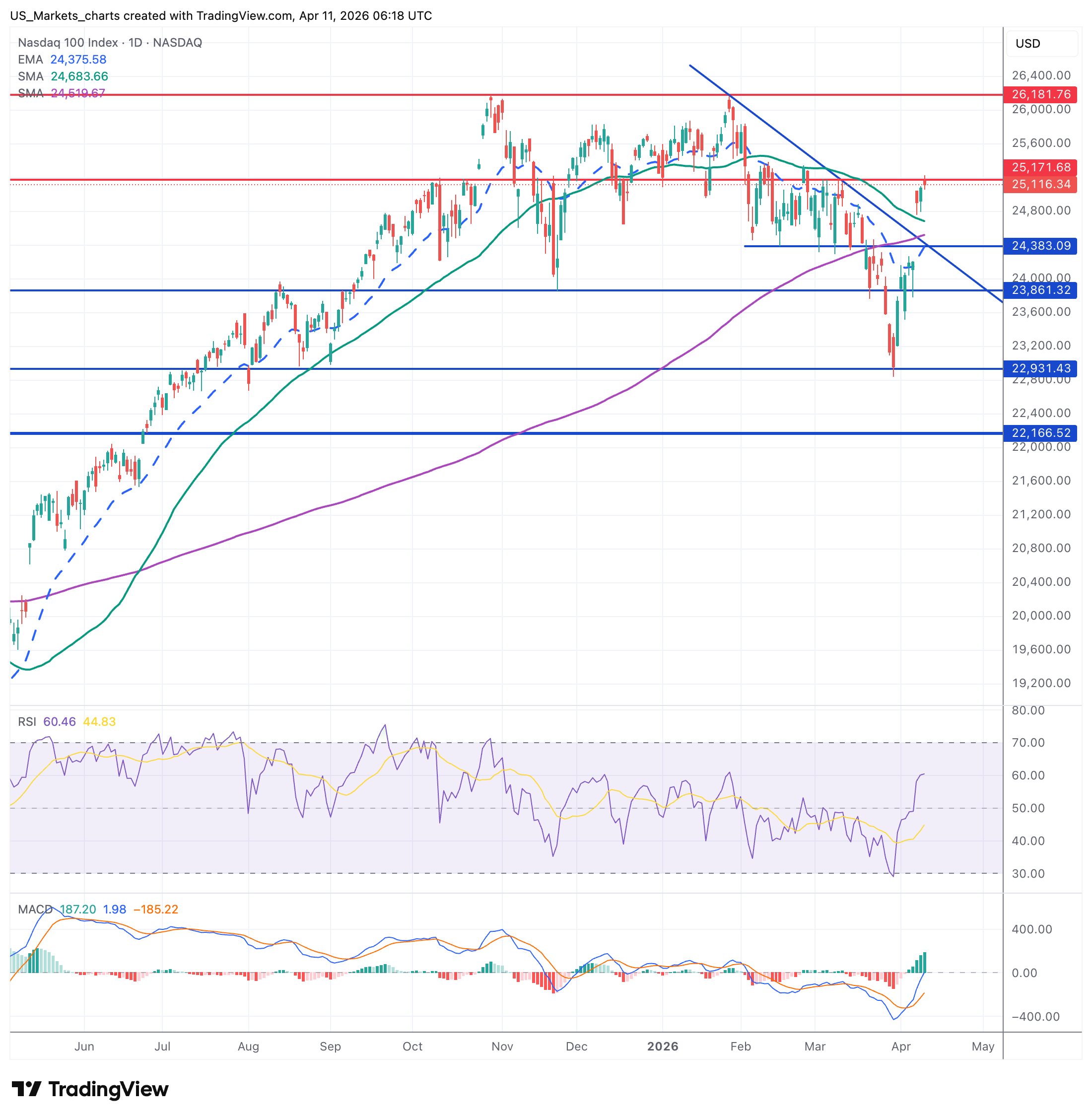 Bull: NDX houdt 24.383 als steun, breekt de dalende driehoek opwaarts, test 25.116 en 25.171.