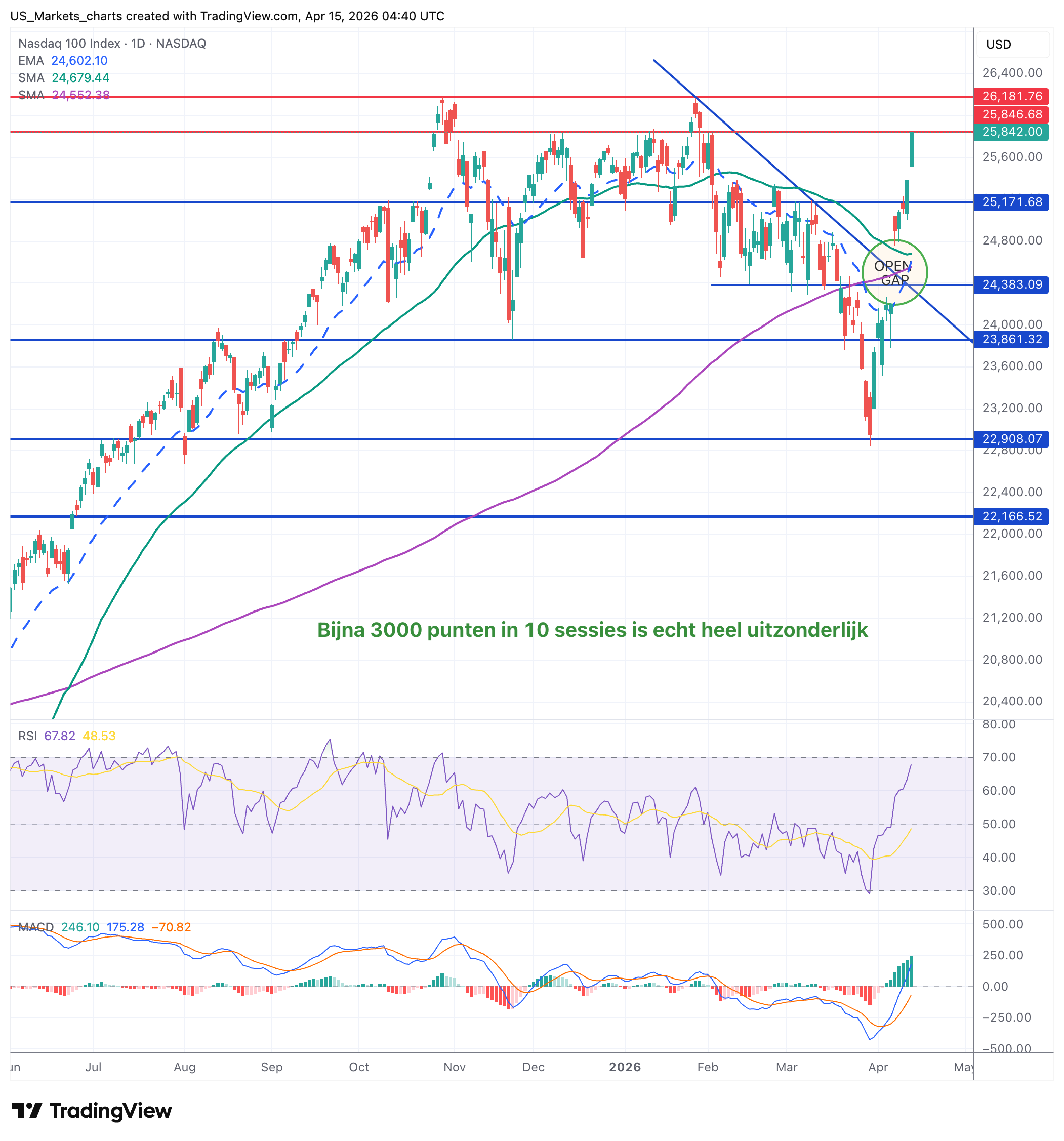 De Nasdaq 100 noteert op 25.842, terug een nieuwe rally bovenop de reeds 10 dagen lopende rally en ver boven de GAP die de index na de bestand-rally op 8 april achterliet. Het EMA-20 staat op 24.600. De RSI 68: positief maar afnemend momentum. Een break boven 26.000 heropent het bull-scenario richting een nieuw record. Steun nu rond de 25.200 en 24.800 tot de GAP zone.