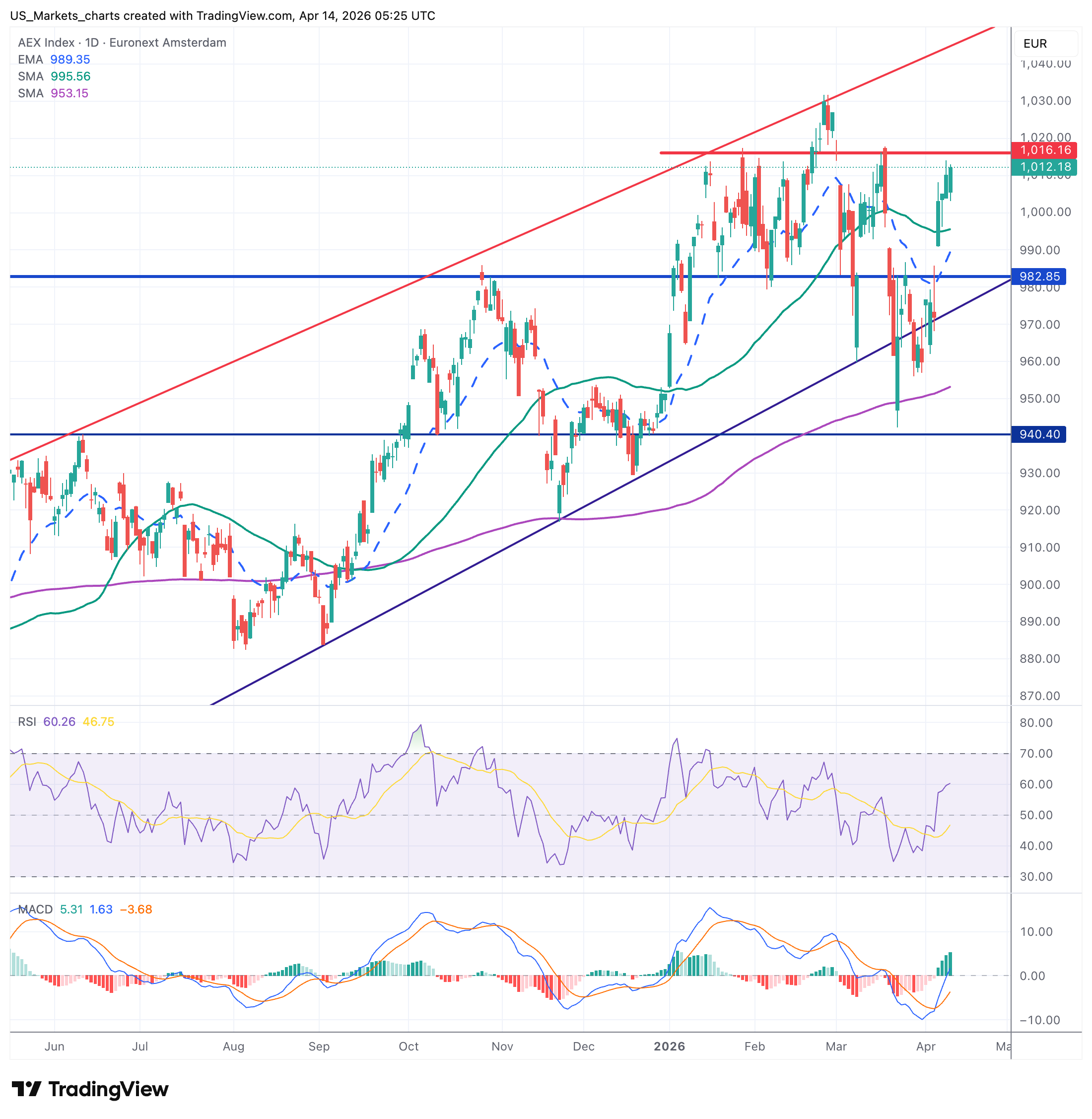 De AEX noteert op 1.012,18 en staat daarmee ruim boven het EMA-20 (989), het SMA-50 (995,5) en ver boven het SMA-200 (953). Alle drie de gemiddelden zijn terugveroverd. Weerstand bij 1.015 kan nu het volgende doel worden. De RSI op 60 blijft een positief momentum afgeven met nog wat extra ruimte. MACD draait opwaarts. Steun nu rond de 983 bij een eventuele terugval.