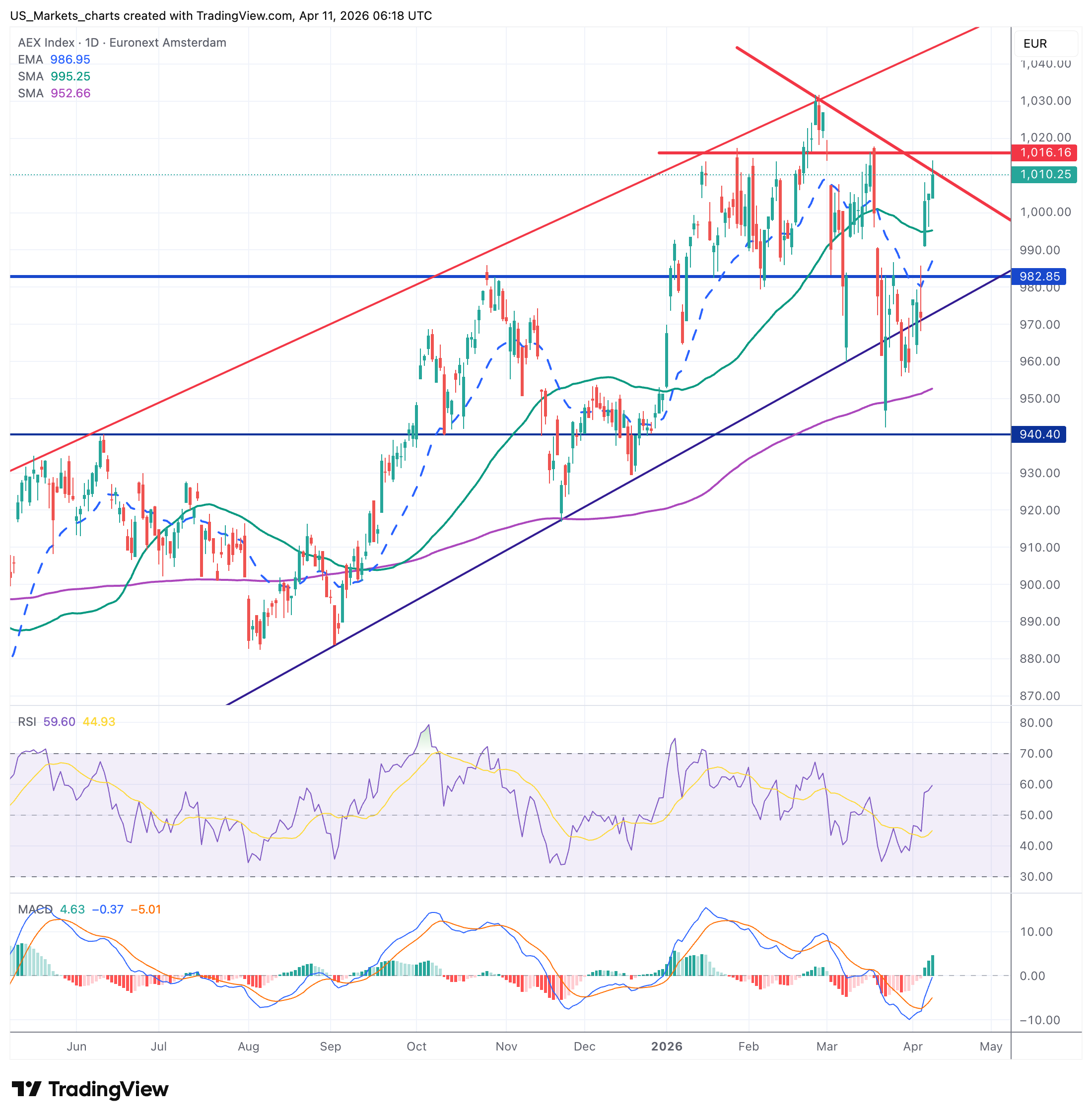 De AEX herstelde snel tot boven de 1.000-grens naar 1.010,25. RSI op 60 is positief. MACD keert positief. De converging rode lijnen op de grafiek zijn doorbroken: dat is bullish. UMG gaf een nodige boost. Shell leverde terrein in door de dalende olieprijzen. Weerstand bij 1.015 en 1.020. Steun op 983 en EMA-20 (987). Mooie technische vooruitgang.
