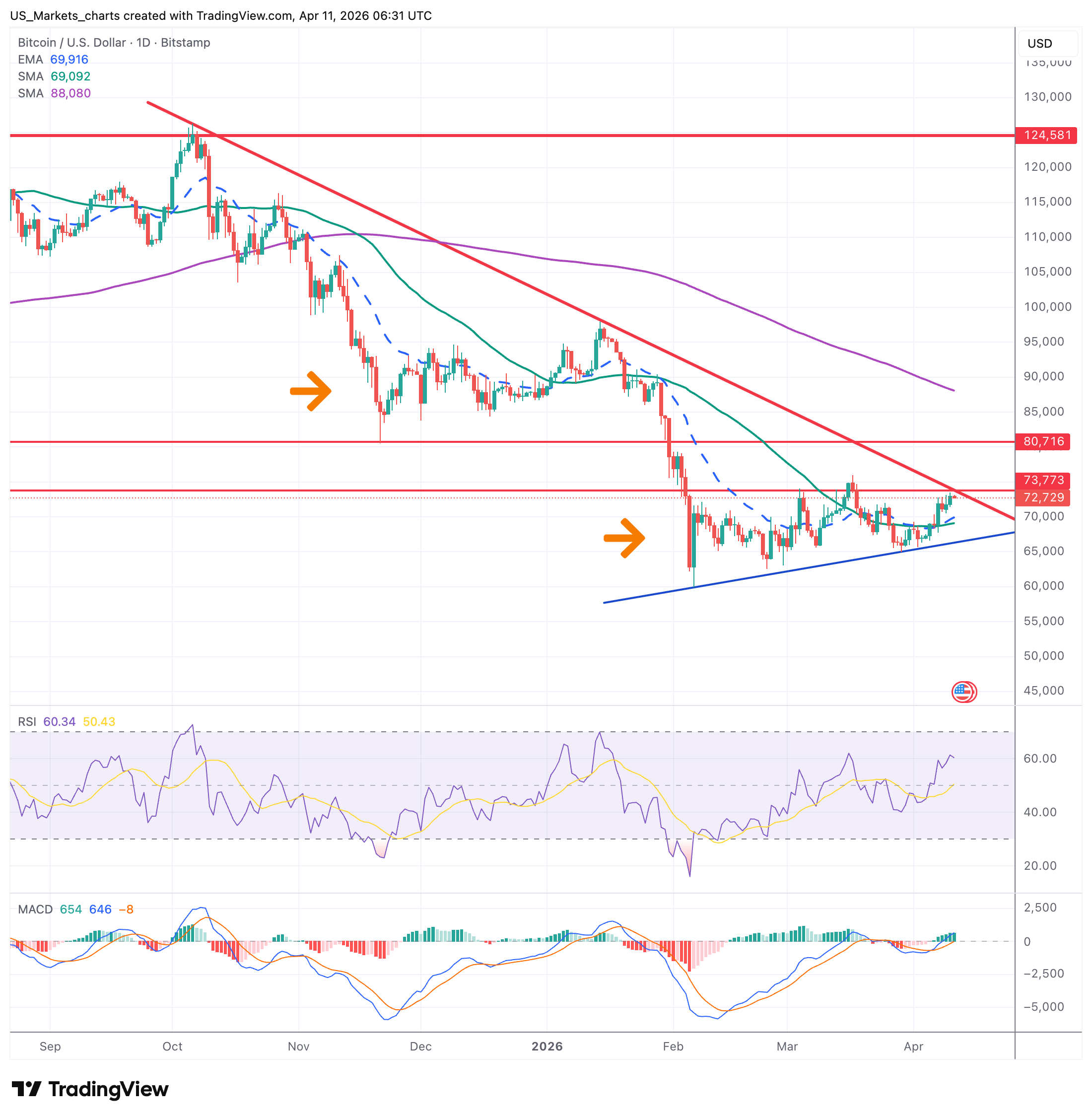 Bitcoin steeg 9% naar $73.000. De twee oranje pijlen op de grafiek markeren de twee consolidatiebodems. De dalende wig van de rode lijnen is doorbroken naar boven. RSI op 60+ is positief. MACD keert positief. EMA-20 ($69.900) en SMA-50 ($69.100) zijn nu steunlijnen. Weerstand bij $73.773 (rood) en $80.716 (rood). Een doorbraak boven $80.716 opent het pad naar $88.080 (SMA-200).