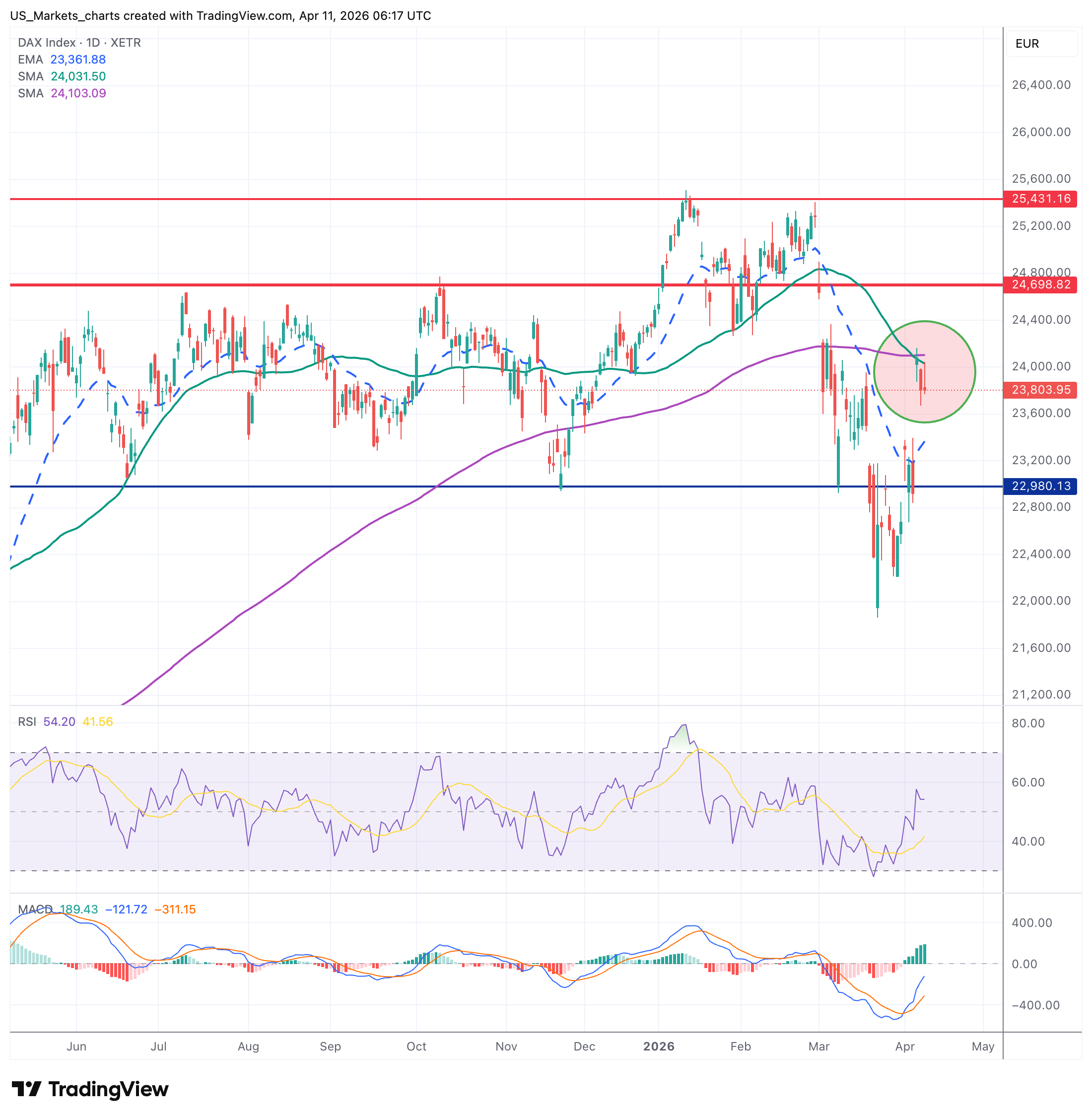 De DAX sloot op 23.804, boven het EMA-20 (23.350): een positief signaal. RSI op 54 is neutraal-positief. MACD keert positief met groene histogram-bars. De roze cirkel markeert het herstel van de bodem rond 22.000 naar 23.800 in amper enkele dagen tijd. Weerstand bij het SMA-50 (24.030) en de rode horizontale lijn op 24.700. Een slot boven 24.030-24.100 bevestigt de technische trendommekeer.