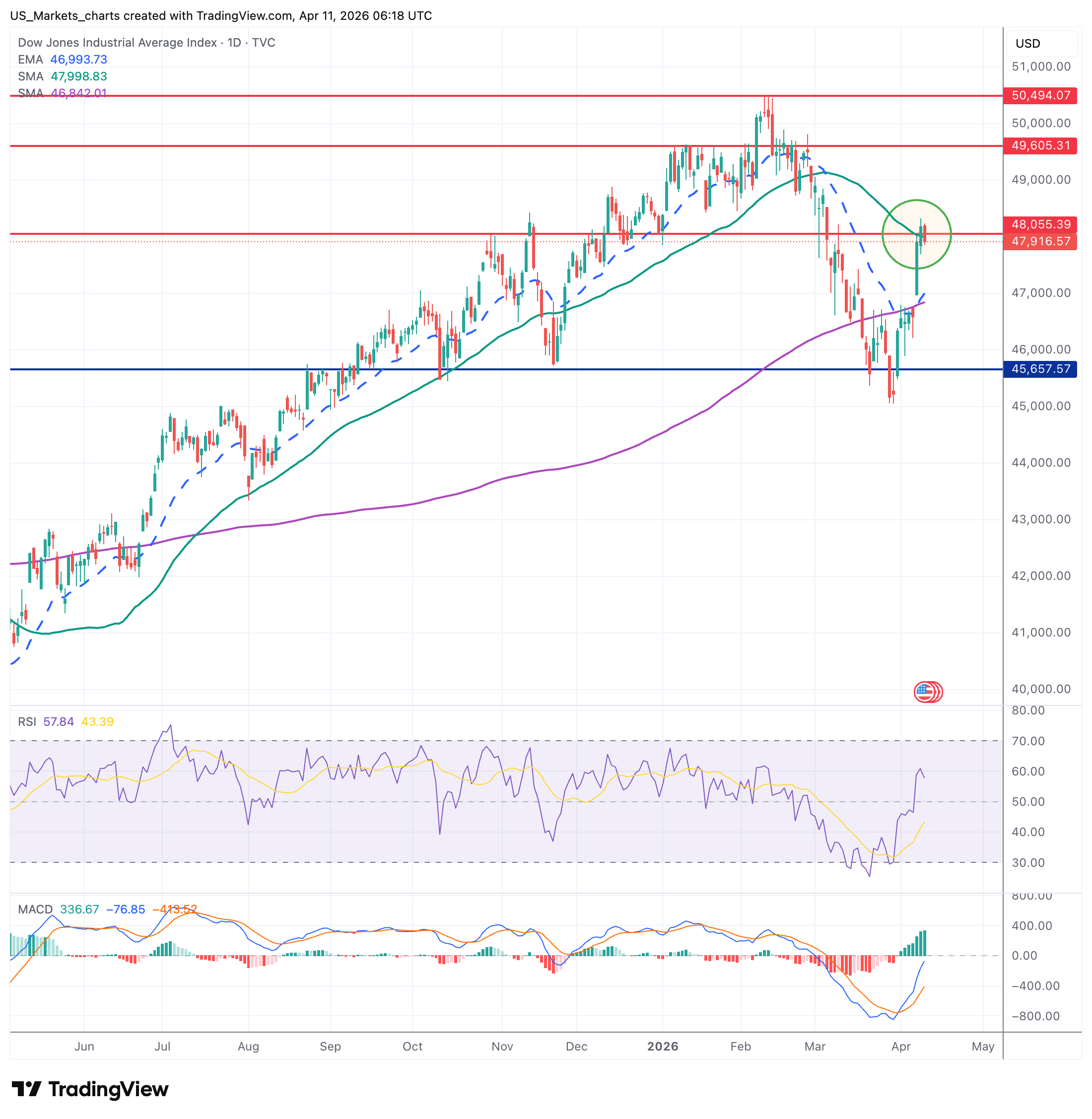 De Dow Jones herstelde naar 47.917 en staat voor het eerst dit jaar positief op jaarbasis. RSI op 58 is neutraal-positief. MACD keert positief: eerste groene bars sinds weken. De groene cirkel markeert de V-herstelbeweging. Weerstand op de rode horizontale lijn bij 48.050. Steun op EMA-20 (47.000) en SMA-200 (46.850).