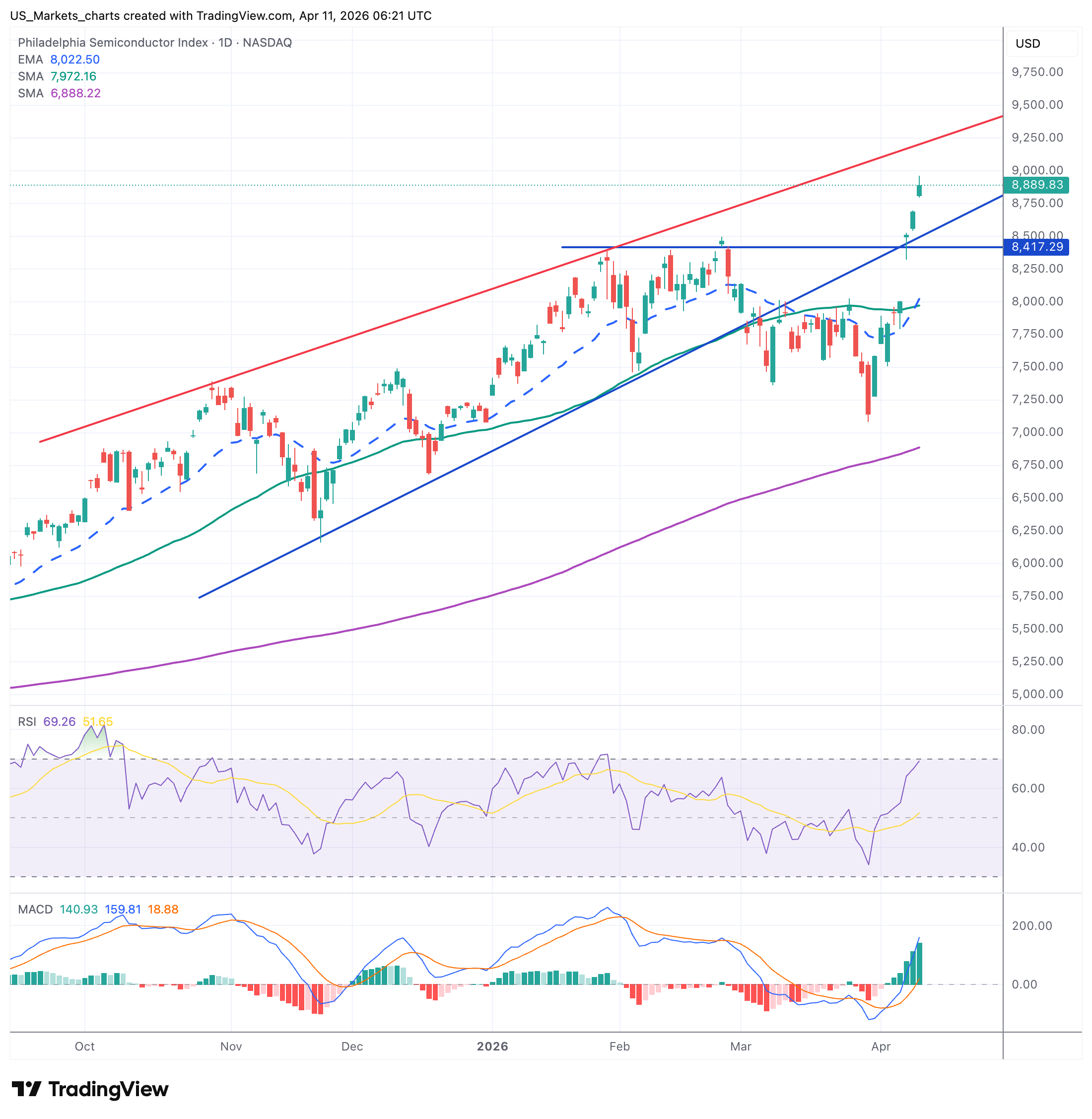De Philadelphia Semiconductor Index bereikte vrijdag een nieuw intraday all-time high op 8.889,83, het eerste record sinds februari 2026. Semis leiden de volledige rally van week 15 na het Iran-bestand. RSI op 69 nadert overbought-territorium maar is nog niet erboven. MACD op 141, sterk positief. Lam Research, ASML, Micron, Intel en Western Digital stonden aan de kop. Steun op 8.400, de blauwe horizontale lijn. De opwaartse trendlijn in blauw blijft intact. Dit is het sterkste technische TA-beeld van alle zeven geanalyseerde grafieken.