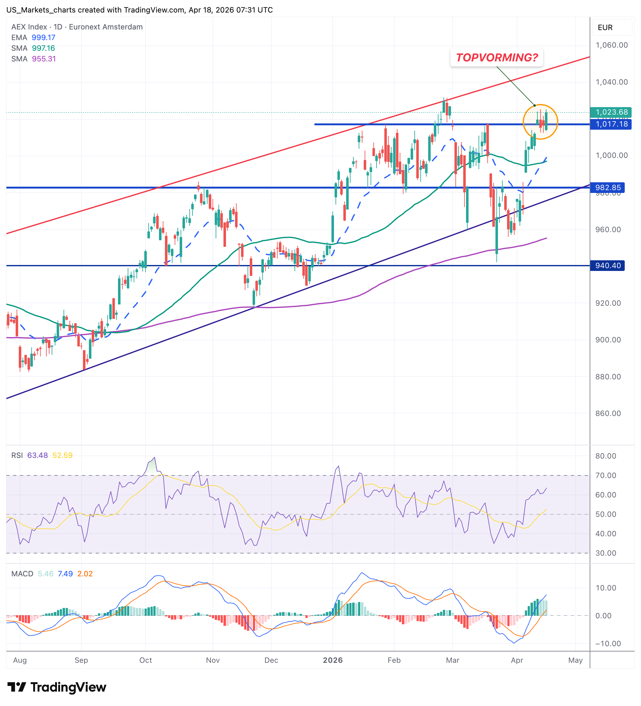 S&P 500: weekslot 7.126,06 (NIEUW RECORD). Weekwinst +4,5%. Eerste keer ooit boven 7.100 (vrijdag 17 april). Achtste all-time high al in 2026. RSI op 73 nu wel behoorlijk overbought. MACD 65,62 sterk positief.