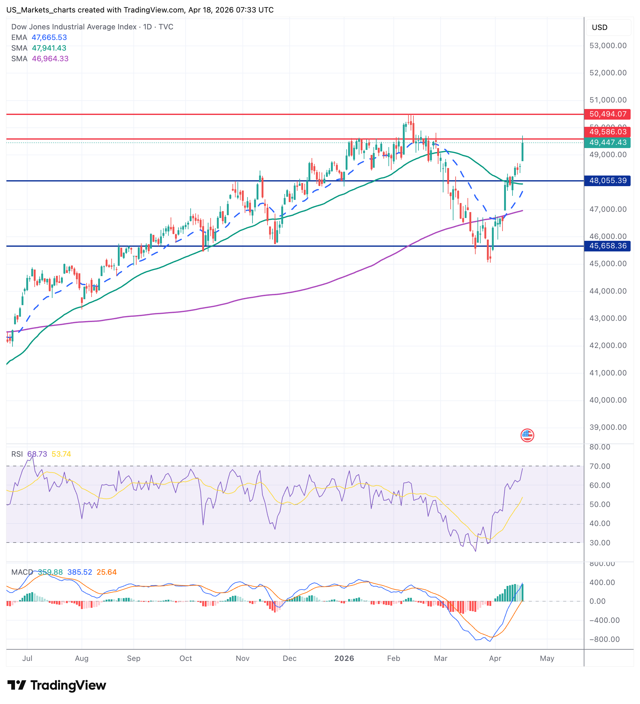 Dow Jones: weekslot 49.447. Weekwinst +3,2%. De RSI 69, nadert overbought. MACD 360 sterk positief. Weerstand op 49.600 en record 50.500.