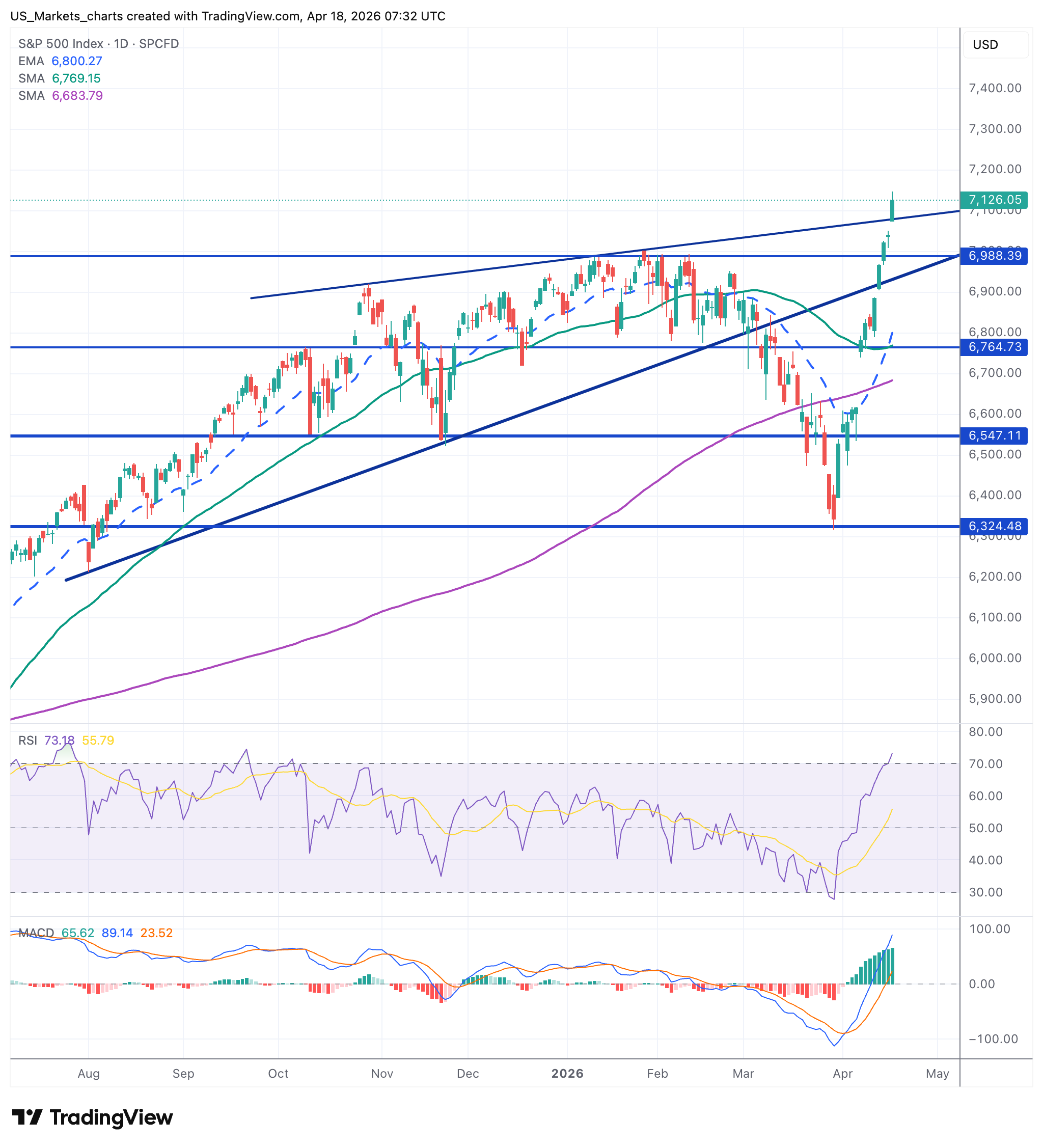 De S&P 500 brak woensdag 15 april voor de allereerste keer de 7.000-grens. Vrijdag sloot de index op een nieuw record dat uitkomt op 7.126. De Nasdaq 100 boekte een 13-daagse winststreek en staat op 26.672: bijna 3.850 punten gewonnen in 13 sessies. De SOXX noteert acht opeenvolgende intraday all-time highs ofwel records. Ook de Dow Transport zet de opmars onverminderd voort.