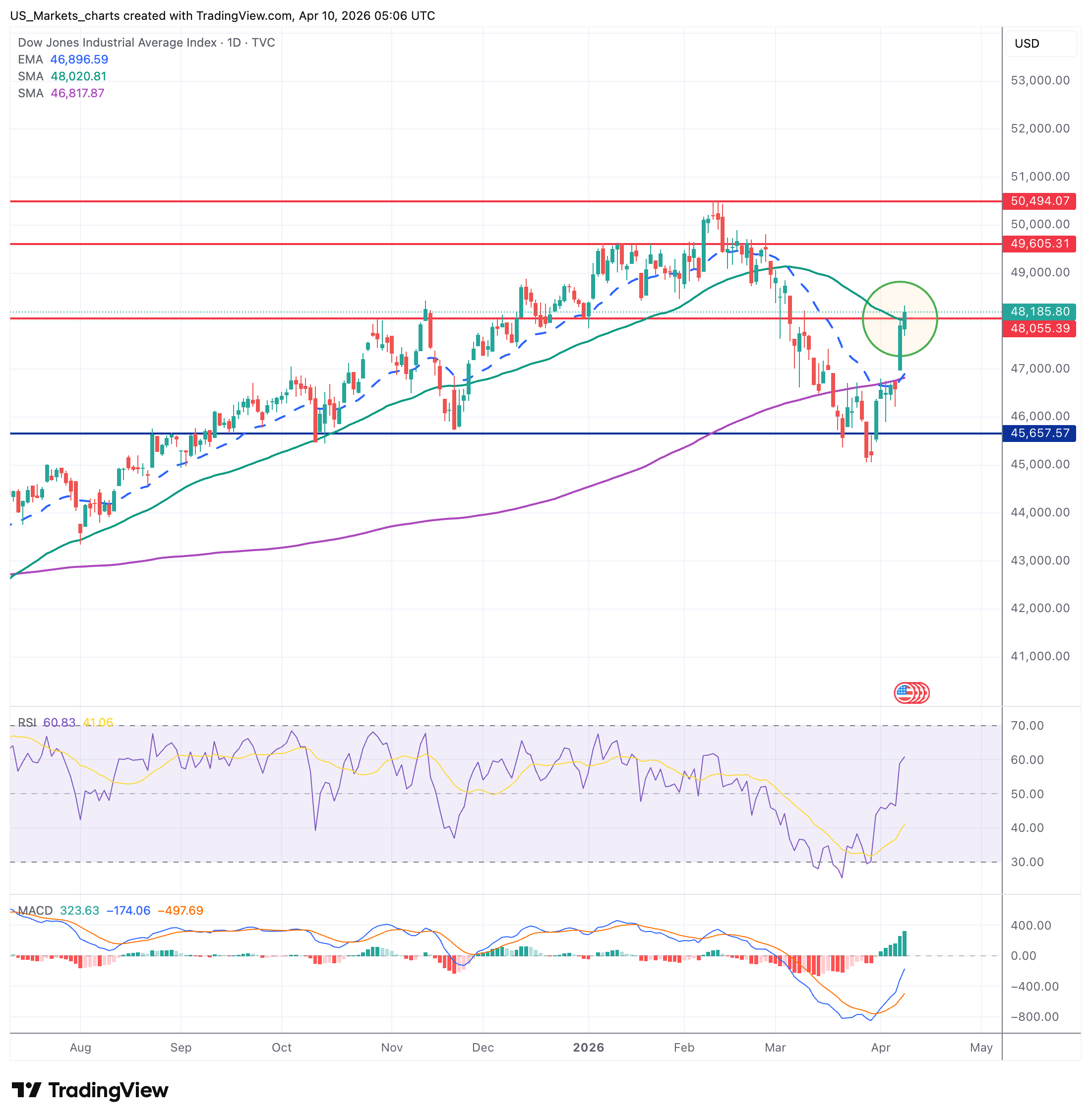 Bull: Dow houdt 48.050, en test de 49.000 en zet de beweging door richting de recordzone boven 50.000.