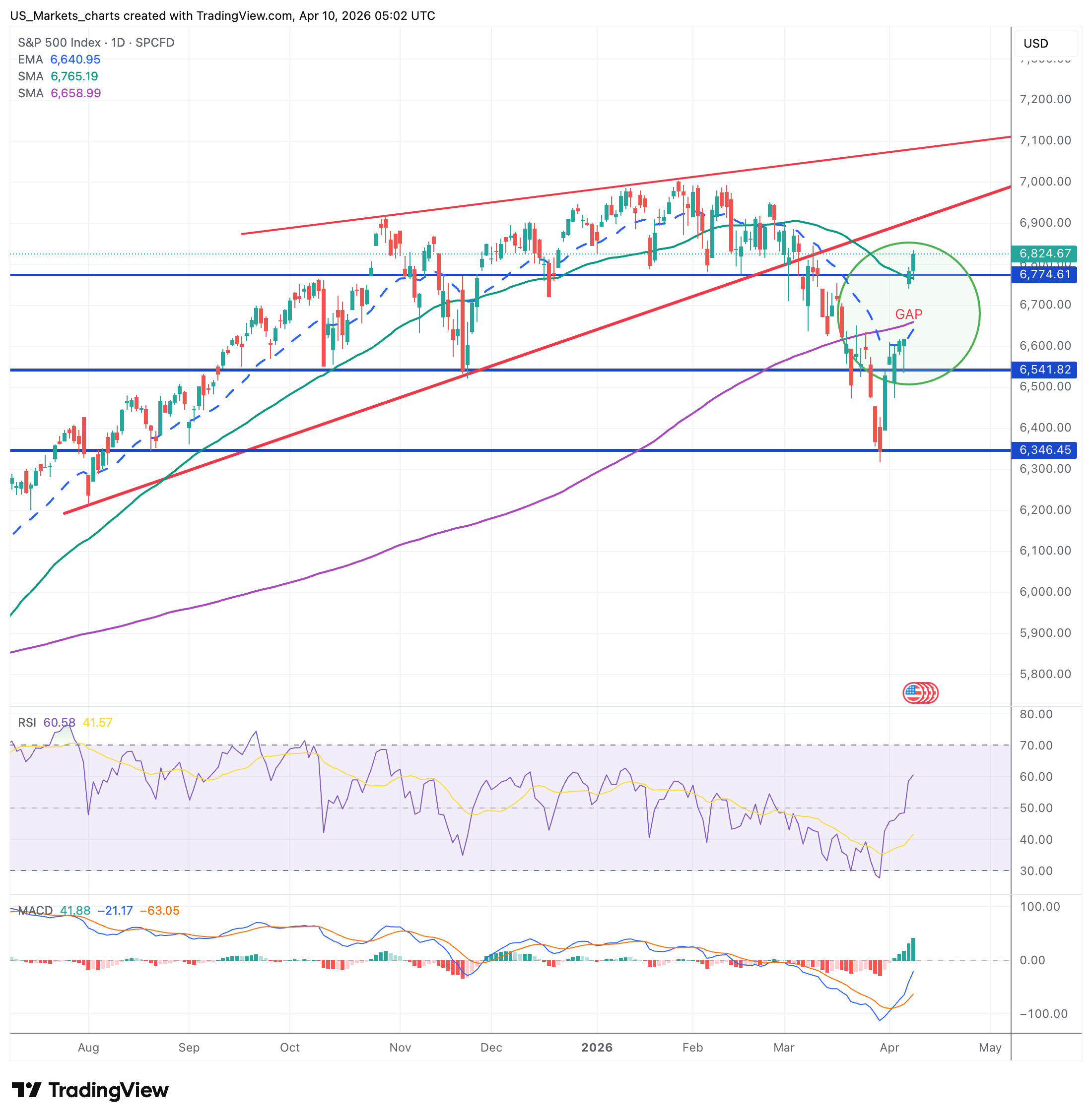 De S&P 500 noteert op 6.825 en staat ruim boven het EMA-20 op 6.640 en het SMA-200 op 6.660. De grafiek toont een groene cirkel met "GAP" rechts: de ceasefire-opening van woensdag liet een technische gap achter die nog niet lang niet is gedicht. Weerstand bij 6.775 (blauwe lijn) is doorbroken, de volgende weerstand ligt bij 6.825 en daarboven het volgende weerstandsniveau rond de 6.900. RSI 61: positief momentum, nog wat ruimte voor een verdere stijging.