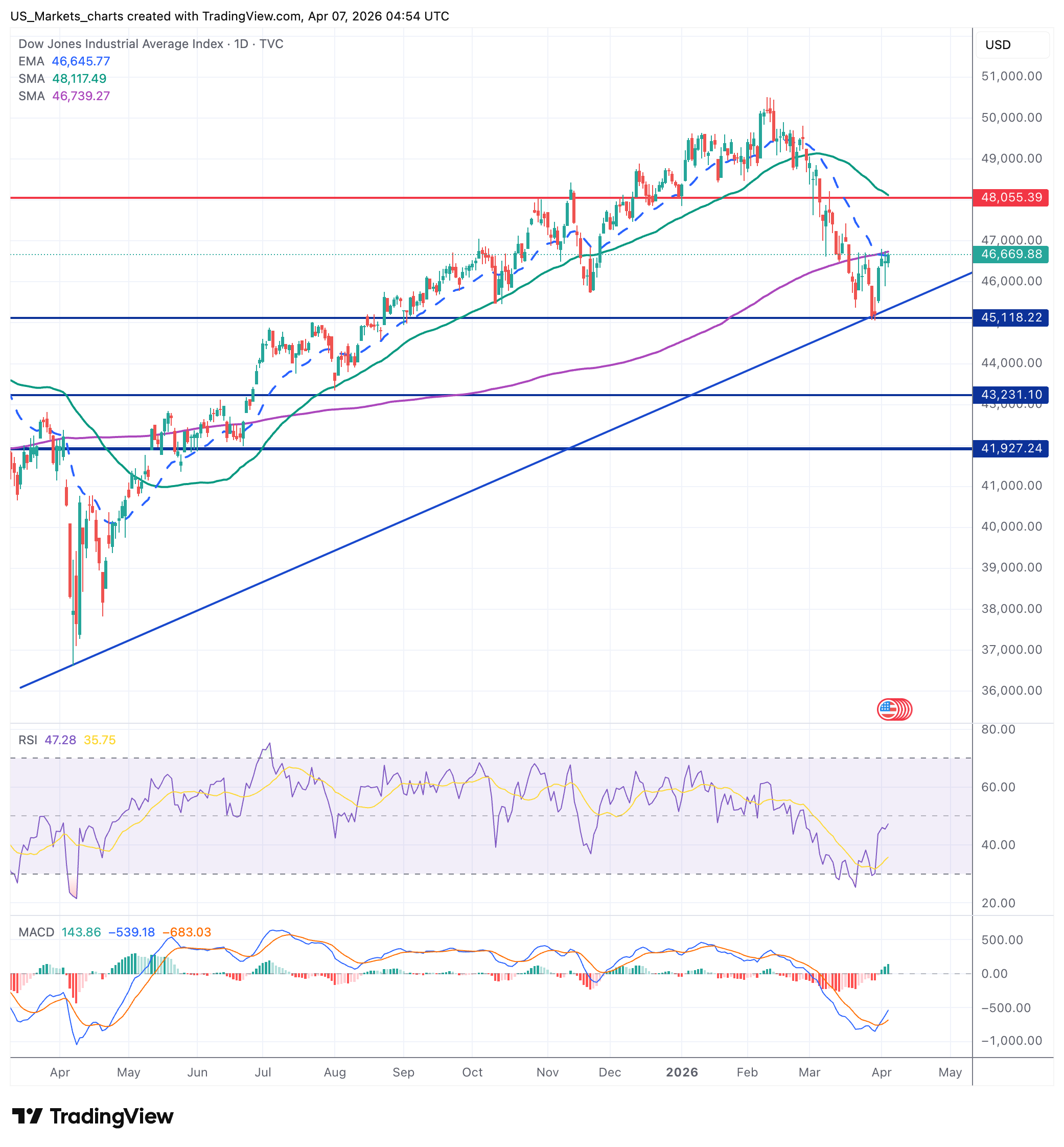 Bull: ceasefire-deal, rentes dalen, Dow herstelt richting het EMA-20 en test 46.750 en zet door richting de 48.000.
