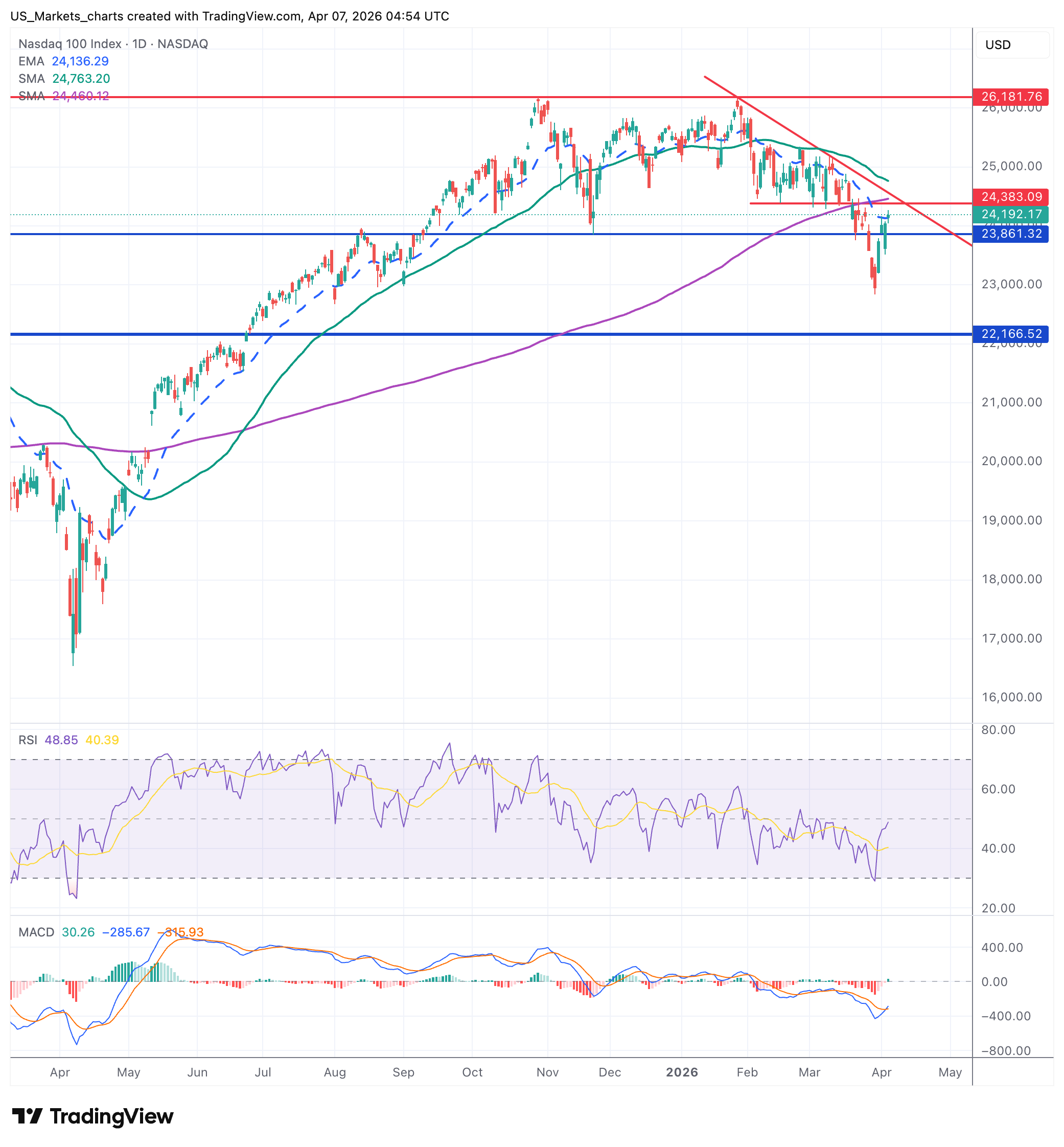 Bull: deal voor deadline, Nasdaq 100 houdt 24.000, herneemt het EMA-20 op 24.140 en test het SMA-200 op 24.450.