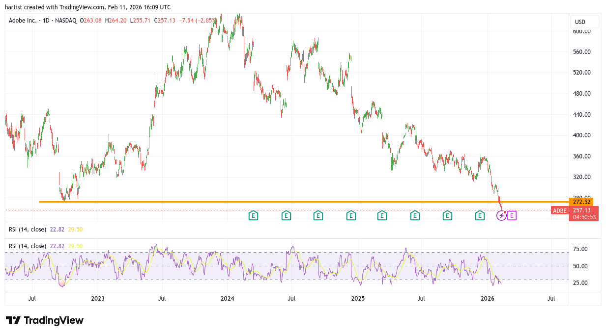 De derde gevallen engel in de column van vandaag is Adobe. Twee jaar geleden nog ruim boven de 630 en nu vinden we de koers terug onder 260 dollar. Ook hier levert de koers de laatste maand bijna dagelijks in.