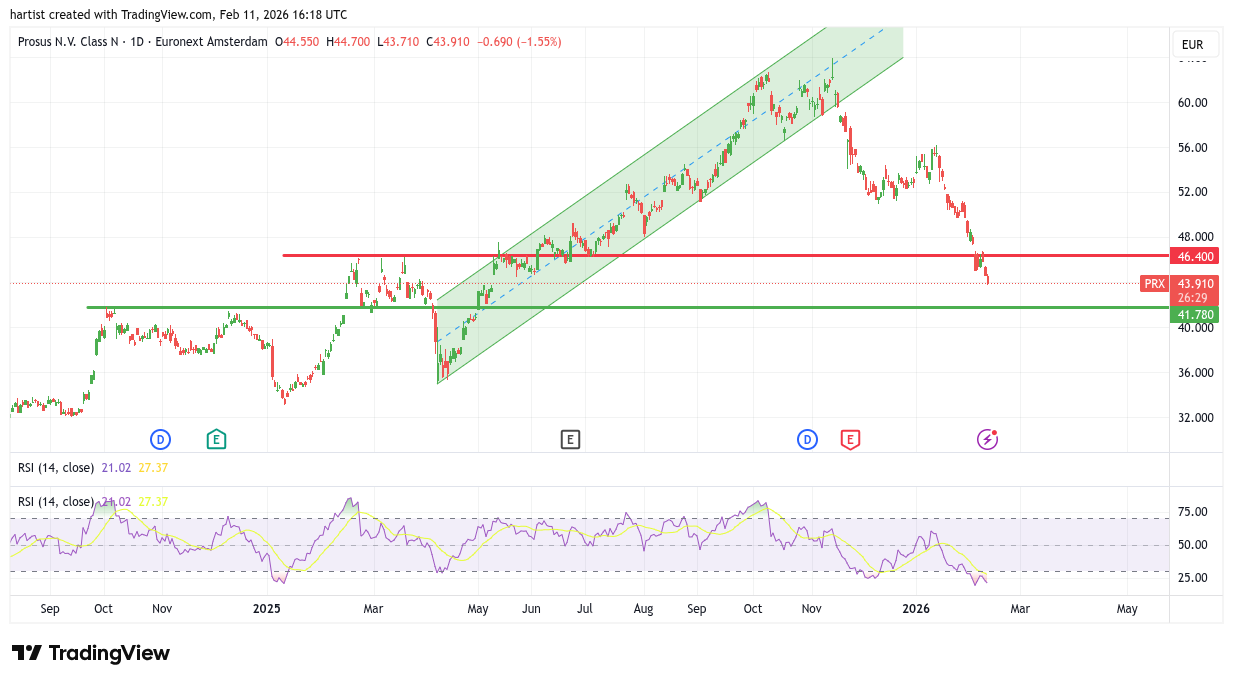 Met de val uit het stijgende trendkanaal gaf Prosus het eerste en zeker niet het laatste verkoopsignaal. Zonder mijn best te doen tel ik er zo nog vijf in de grafiek. Bent u blijven zitten dan bent u een “Buy & Holder” in hart en nieren.