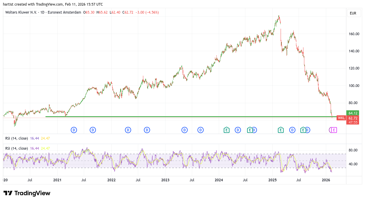 Kan het erger dan bij Relx? Jawel, kijk maar naar deze grafiek. Bij Wolters Kluwer moet ik terug naar 2021 om een koers te vinden die matcht met de huidige koers. Met de strategie Buy & Hold heeft men mooie papieren winsten meegemaakt, maar nu is men na vijf jaar terug bij af.