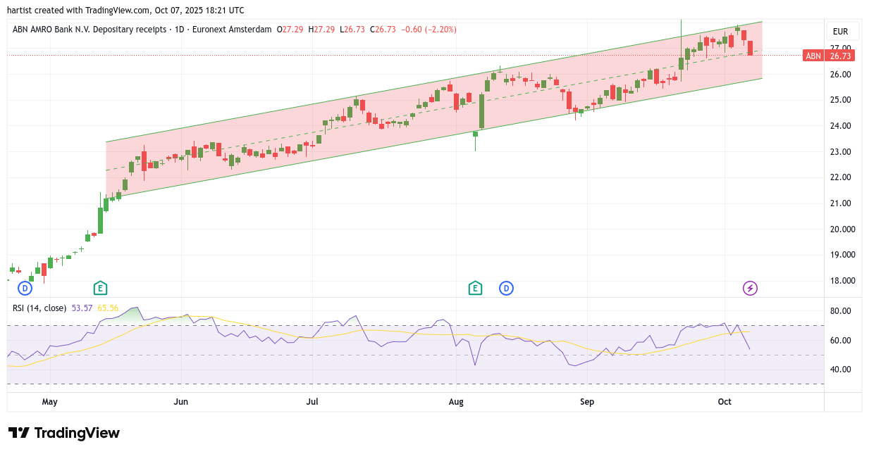 Het heeft wat weg van de Nasdaq niet? Ook zo’n maanden durend opwaarts trendkanaal. The Trend is You Friend, zullen we maar zeggen. Ik zie nog niet direct iets wat een einde zou moeten maken aan de opwaartse trend, of het moet een lichte vorm van negatieve divergentie bij de RSI zijn. Al lijkt met de rode candle van vandaag wel de weg ingeslagen naar het opzoeken van de onderzijde van het stijgend trendkanaal…