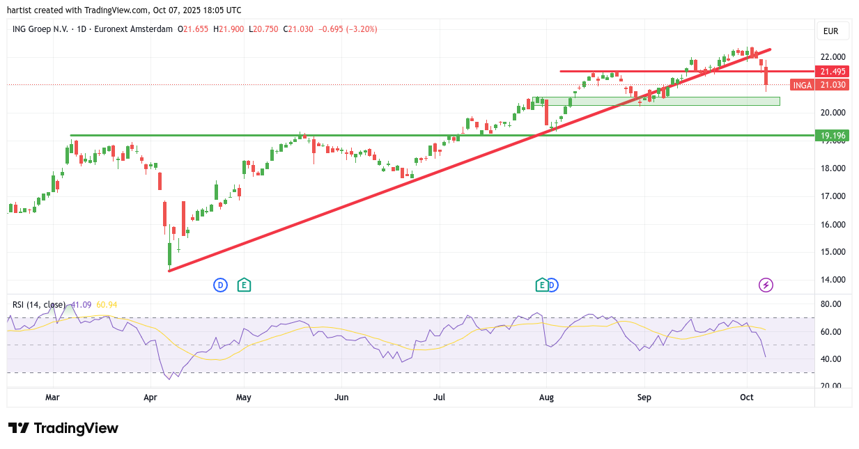 Mochten er lezers zijn die willen discussiëren over de rode stijgende trendlijn dan begrijp ik dat. Echter, hoe ik hem ook zou trekken, hij is neerwaarts doorbroken. Dat maakt de discussie overbodig.