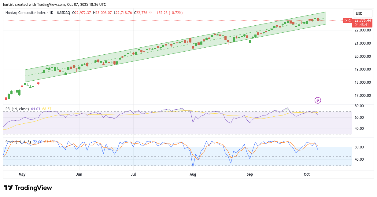 Op moment van schrijven heb ik nog geen aanwijzing dat het over zou zijn met de stijging. De Nasdaq beweegt nog mooi binnen het trendkanaal. Ik zou kunnen schrijven: