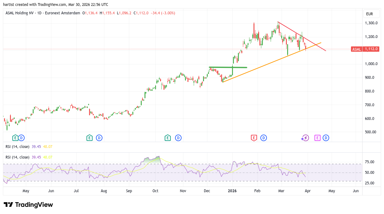 Jazeker, ASML laat over de hele (getoonde) grafiek gezien een mooi en zelfs indrukwekkende stijging zien. Maar helaas gaat het nu over het rechter gedeelte van de grafiek. Daar zien we dat het onder de rode dalende trendlijn iets minder gaat en dat de oranje stijgende trendlijn getest werd vandaag. Nu kan je die lijn ook wat anders tekenen, maar ik heb voor deze variant gekozen. Dat maakt de belegger zeer benieuwd wat er morgen gaat gebeuren, gaat de oranje lijn sneuvelen? Houd strak in de gaten....