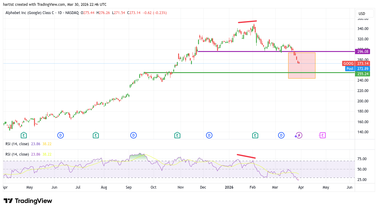 Diegenen die mij volgen weten dat ik de vorige keer dat ik Alphabet behandelde hintte op een H&S. Nu wat verder in de tijd lijkt het verdraaid veel op een Hoofd-Shouderformatie en we kunnen melden dat de neklijn (de paarse lijn) neerwaarts is doorbroken. Ik heb het rode blokje getekend en dat is niet voor niets. De onderzijde daarvan is nu de target. Of we die target gaan halen zal spannend worden, temeer daar de koers dan bij een eventuele verdere daling door de groene steunlijn moet zakken.