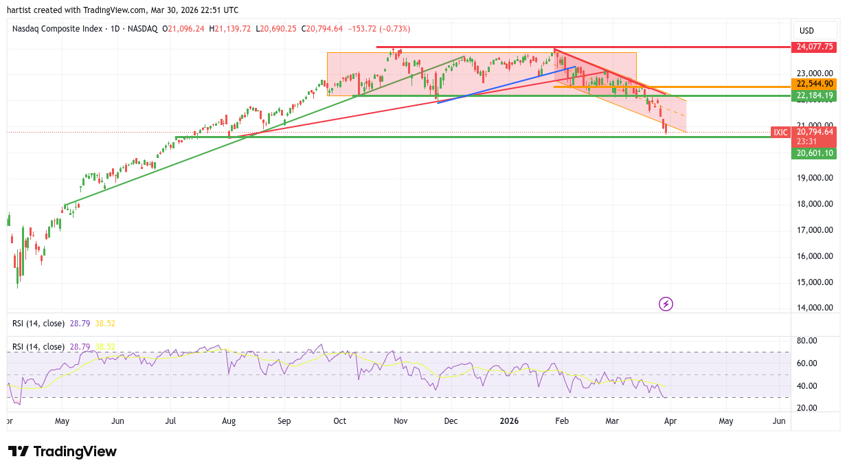 De positieve divergentie bij de RSI waar ik de vorige keer gewag van maakte is niet meer. Inmiddels is de koers zover gedaald dat zelfs het dalende trendkanaaltje neerwaarts is uitgenomen. Vandaag zocht de Nasdaq op het laagste punt zelfs even de groene horizontale steun op. Die steun lijkt wellicht op de grafiek heel wat, maar in de praktijk stelt deze niet veel voor. Kijk maar eens terug op de grafiek hoe "belangrijk" de steun is/ was.