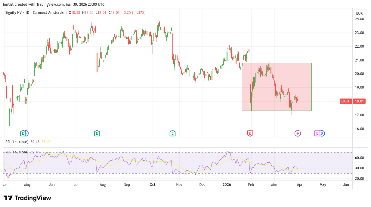 Anders dan ASML is Signify al een tijdje per saldo aan het inleveren. We zien lagere toppen en lagere bodems. De koers is rechts op de grafiek binnen het rode blokje aan het bewegen. Helemaal rechts sluit ik niet uit dat we de onderzijde gaan opzoeken, dat het op een test gaat aankomen. Hetgeen we niet willen is dat de koers de steun test en vervolgens uit het blokje valt. Dat zou het technische plaatje van Signify verder doen verslechteren.