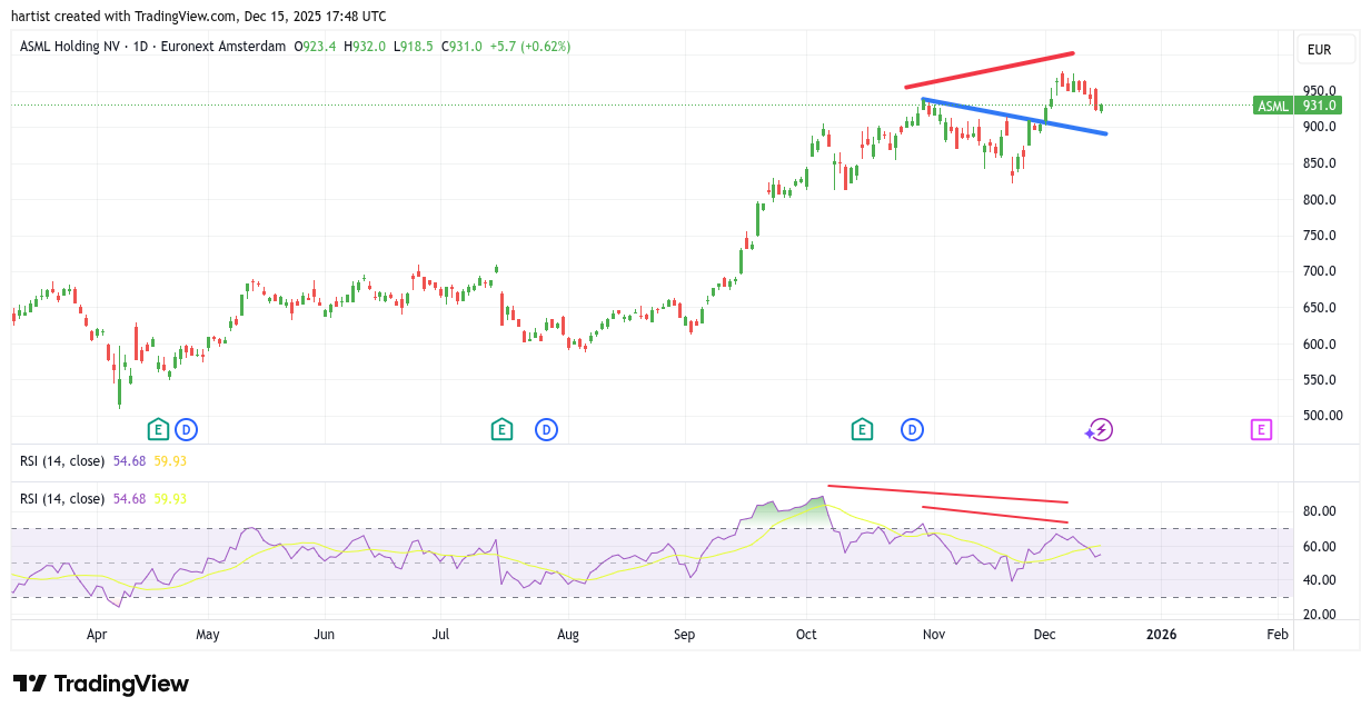 Hier kan ik me van een eerdere column herinneren dat ik wees op de negatieve divergentie bij de de RSI en dat men moest opletten, want de kans op een daling is dan aanwezig. We zien in dit geval dat ASML de laatste twee weken is gedaald.