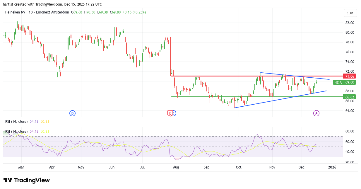 Heineken beweegt per saldo zijwaarts. Aan de bovenzijde heb ik de rode horizontale weerstand getrokken en aan de onderzijde de groene steunlijn. Die had ik overigens al bij een eerdere analyse getrokken en ze zijn nog steeds geldig.