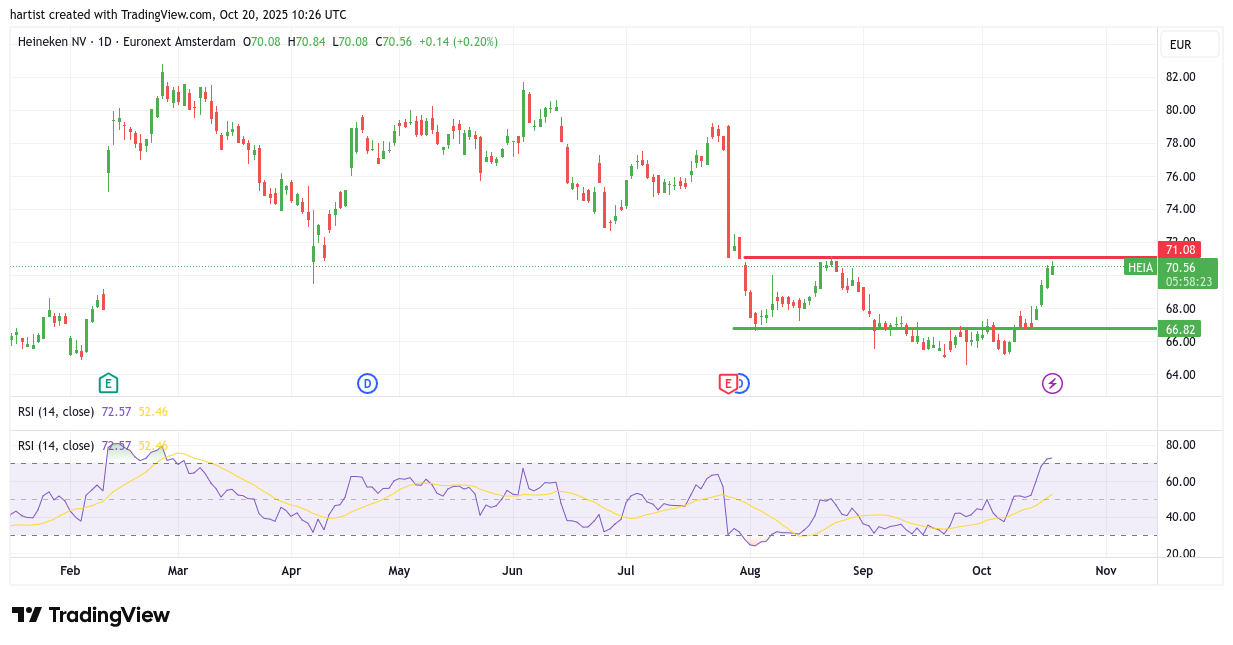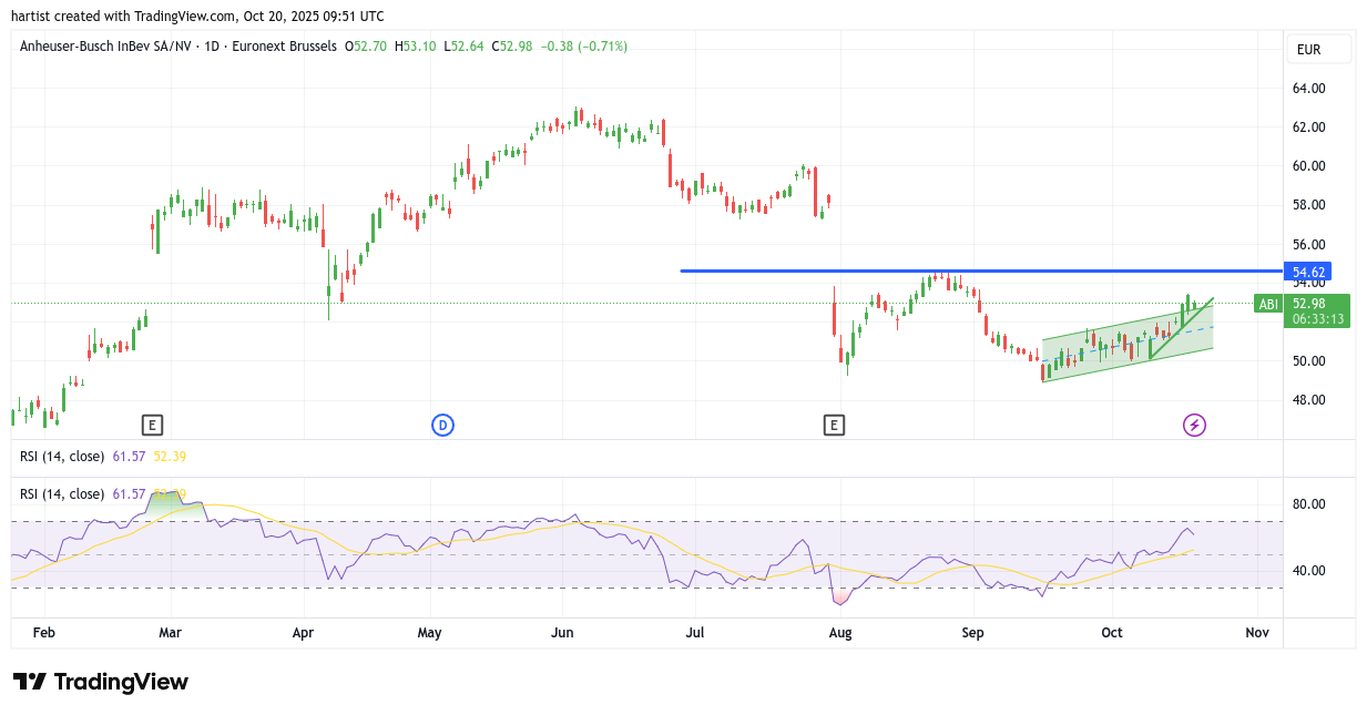 AB Inbev probeert nu rustig te herstellen, binnen een stijgend trendkanaal. Of beter, daar probeert de koers aan te ontsnappen. Tot op moment van schrijven lukt dat en zo zou de blauwe horizontale weerstand wel eens de eerste target kunnen worden.
