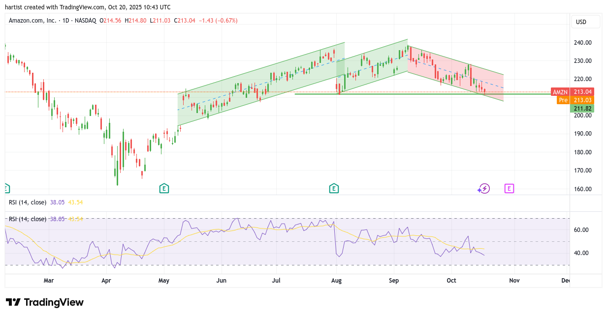 Na twee eerdere stijgende trendkanalen gaat het nu neerwaarts binnen een rood dalend trendkanaal. In die dalende beweging is de koers nu aanbeland bij de groene horizontale steunlijn. De beurs in Amerika is nog niet open, maar de slotkoers van vrijdag lag op die steunlijn. De koers staat dus op een dubbele steun: die van het dalende trendkanaal en van de horizontale lijn. Zit u long? Dan is nu het moment aangebroken extra alert te zijn, een koers onder de steun is niet gewenst.