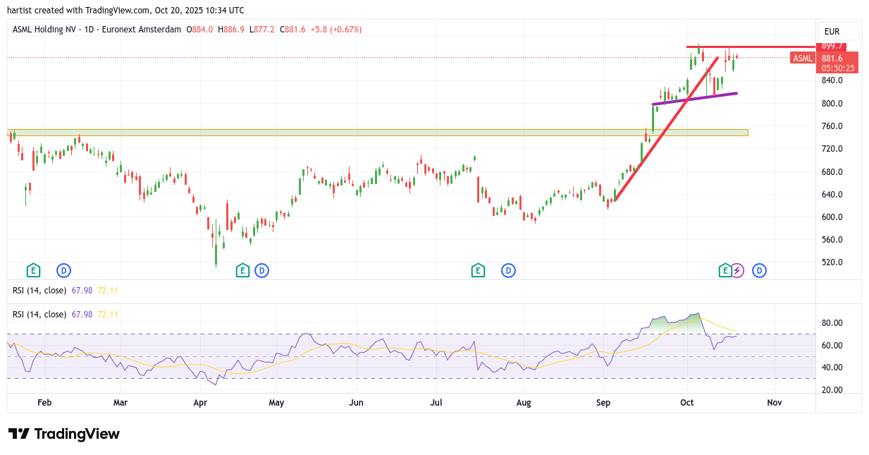 Aan de bovenkant verhinderd nu de rode horizontale weerstandlijn een verder oplopend ASML.