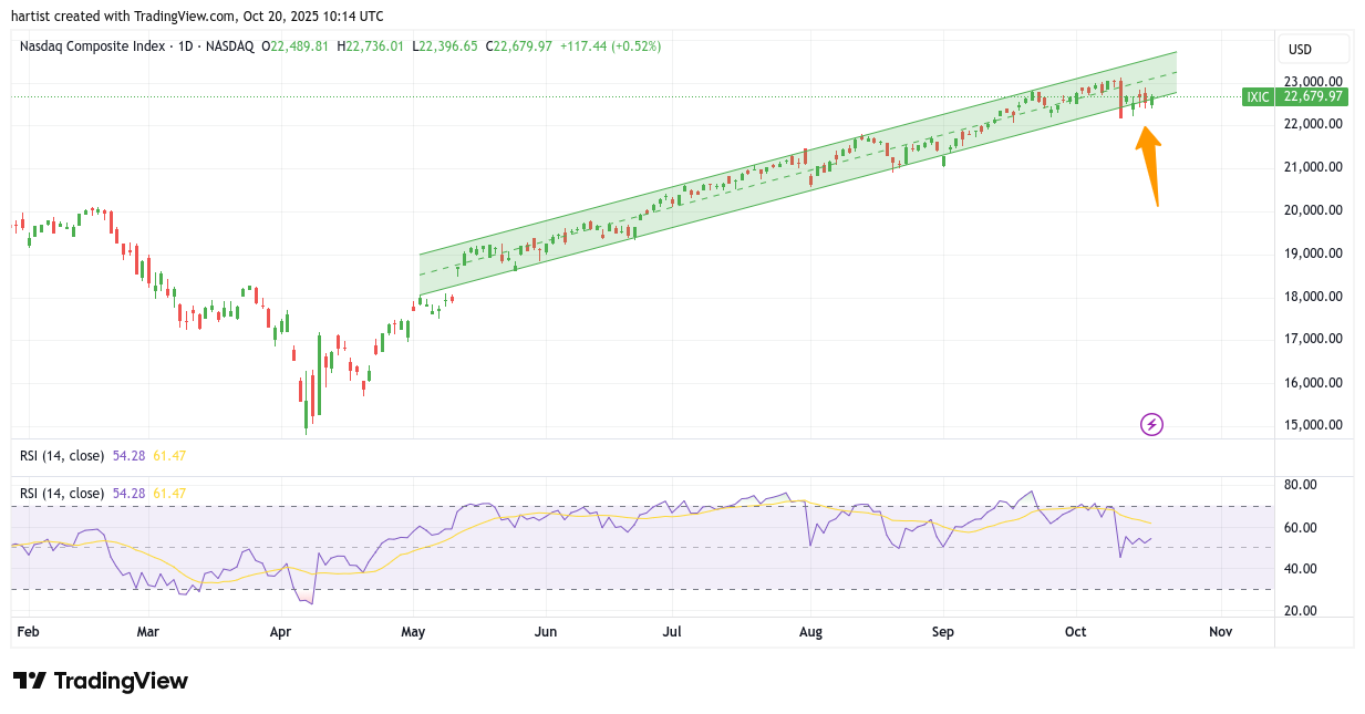 U herinnert zich het stijgende trendkanaal bij de Nasdaq nog wel. Zou de koers er nog steeds binnen bewegen?