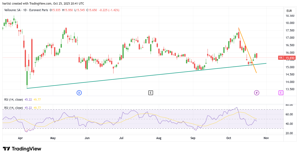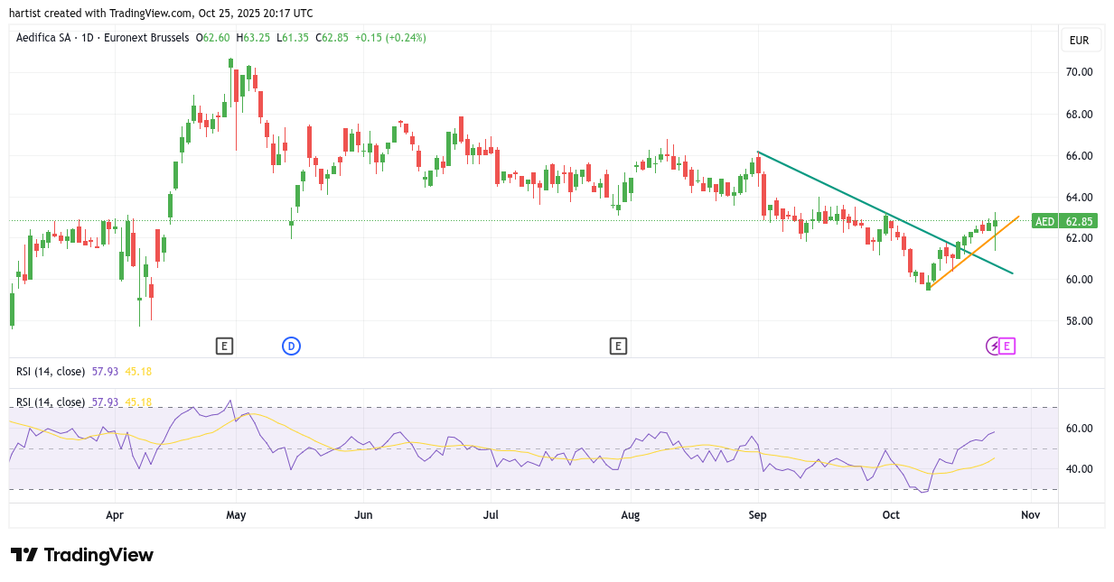 De grafiek is moeilijk, want de trend is dalend, al vanaf eind mei dit jaar. Maar aan de andere kant, boven de oranje stijgende trendlijn doet de koers zijn best. Er staan al twee wapenfeiten: