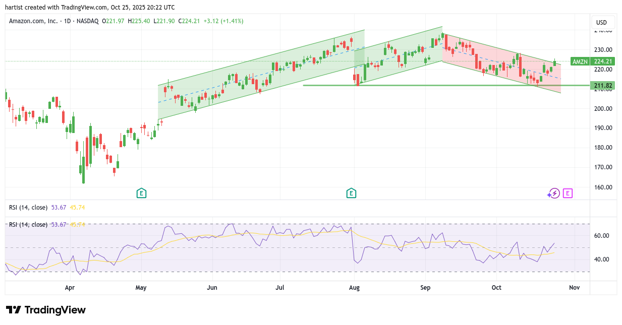 Amazon liet op het scheiden van de beursweek een positief signaal noteren: de koers brak met een slotkoers opwaarts uit het rode dalende trendkanaal. De test van de groene horizontale steunlijn bleek een geslaagde!